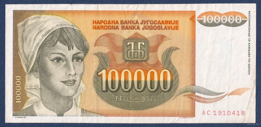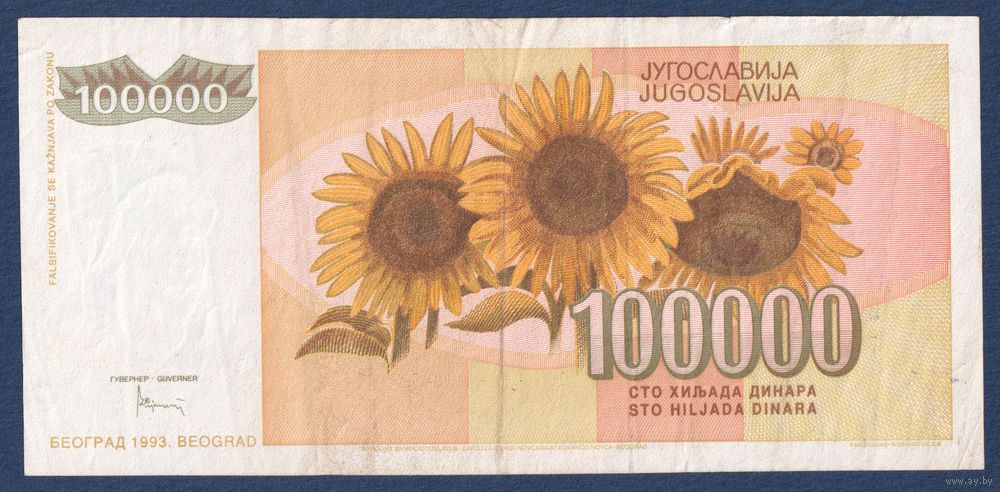 Югославия, 100000 динаров 1993 г, P-118 (AС, крестьянка, подсолнухи), VF