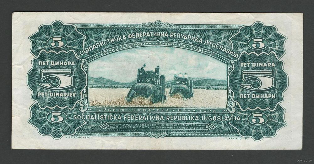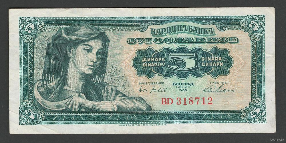 Югославия 5 динар 1965 года. Тип P-77b. Большой номер. Состояние XF-