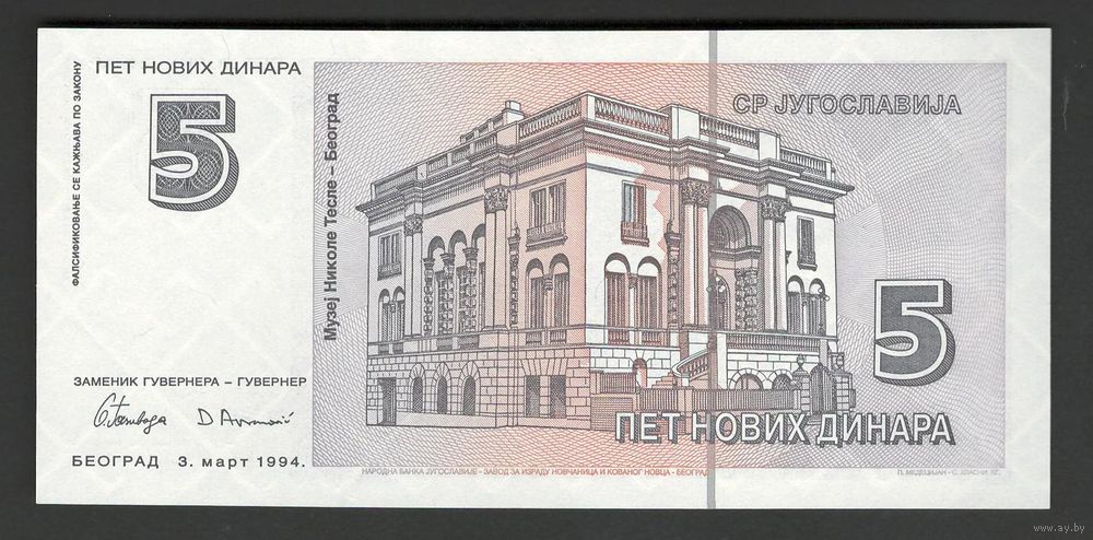 Югославия 5 динар 1994 года. Тип P-148. Состояние UNC
