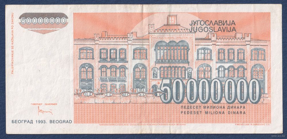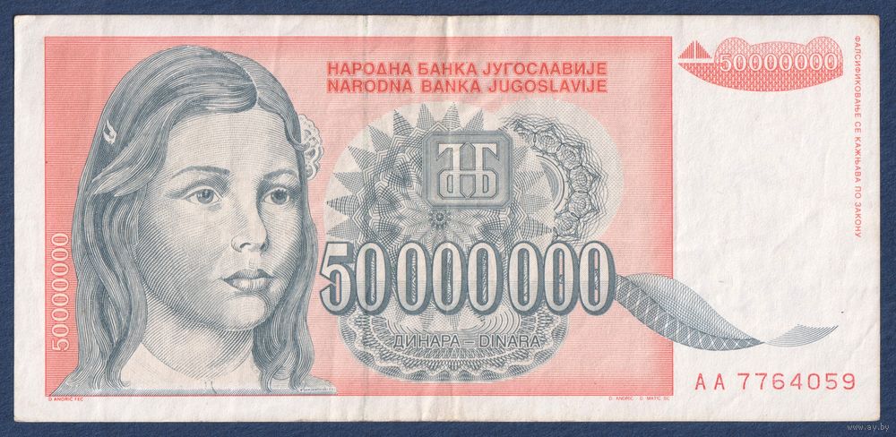 Югославия, 50000000 динаров 1993 г, P-123 (AА, девочка, Белградский университет), VF