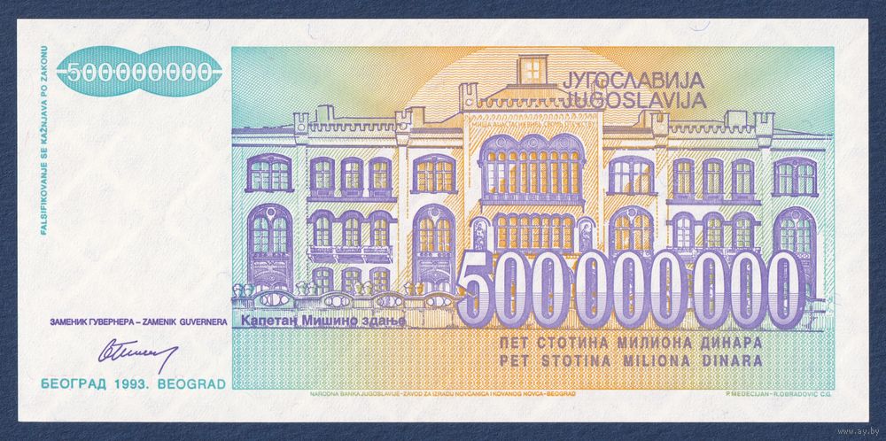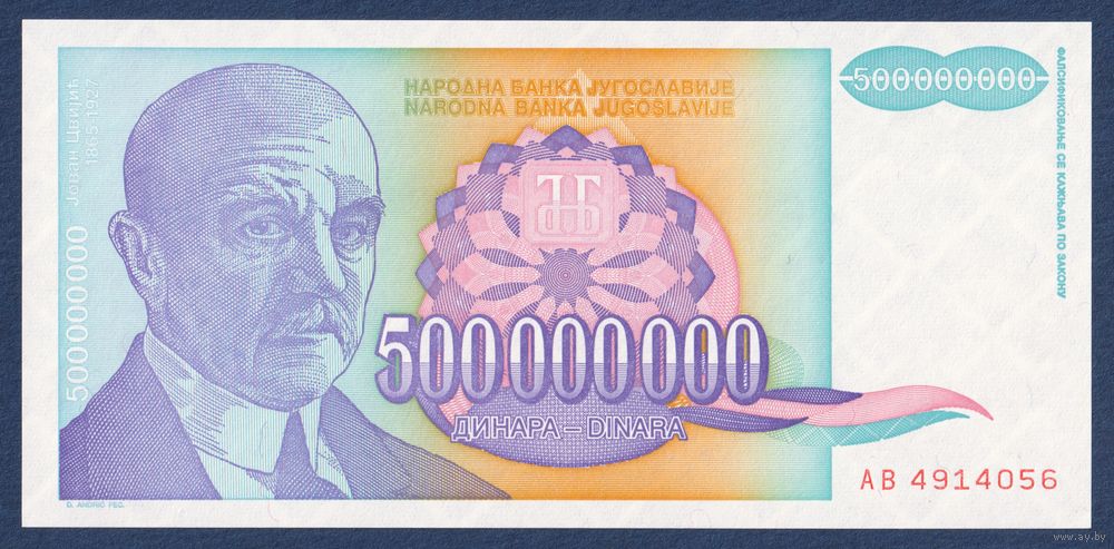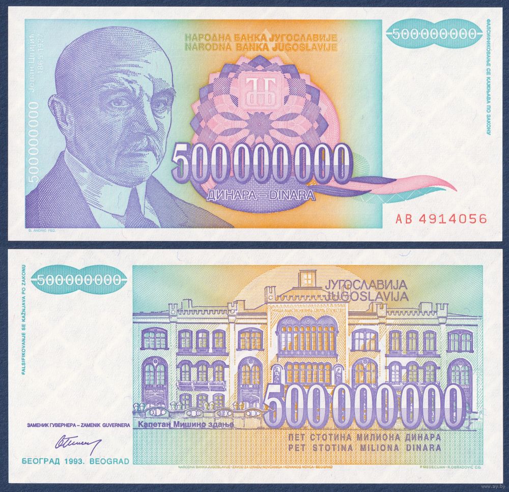 Югославия, 500000000 динаров 1993 г, P-134 (AB, географ Йован Цвийи), UNC
