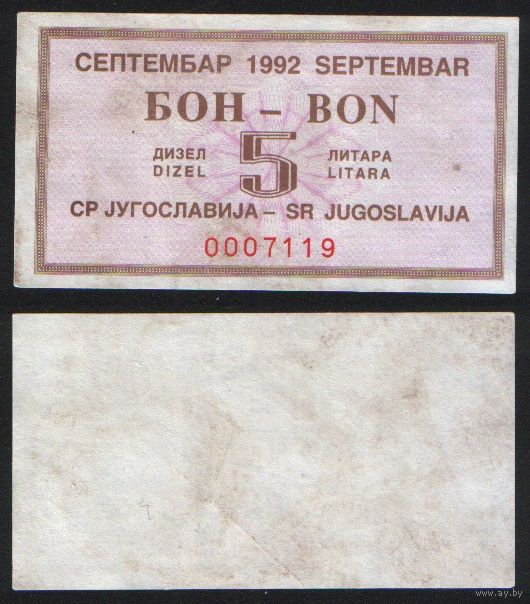 Югославия. Талон на 5 литров дизельного топлива сентябрь 1992 года ' 0007119 ТОРГ