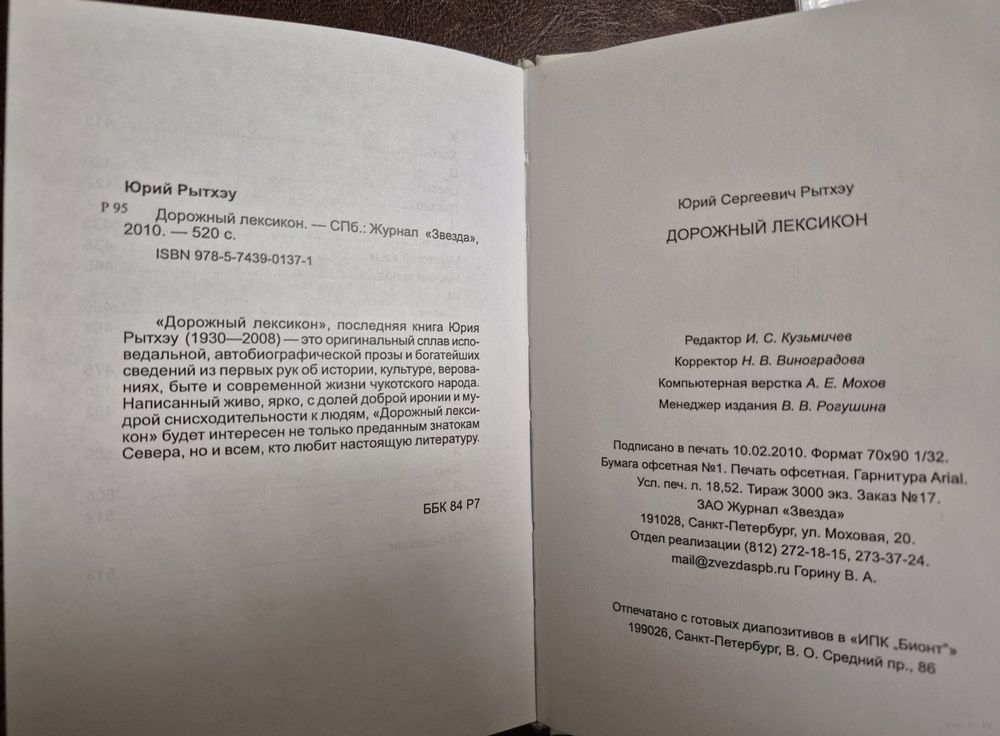 3. Юрий Рытхэу, Дорожный лексикон. СПб: Звезда, 2010, 520 с.