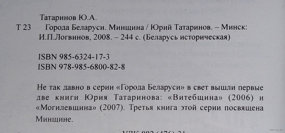 Юрий Татаринов. Минщина. Города Беларуси в некоторых интересных исторических сведениях. (Беларусь историческая) Минск. 2008 г. 241 с. Мягкая обложка, Обычный формат.
