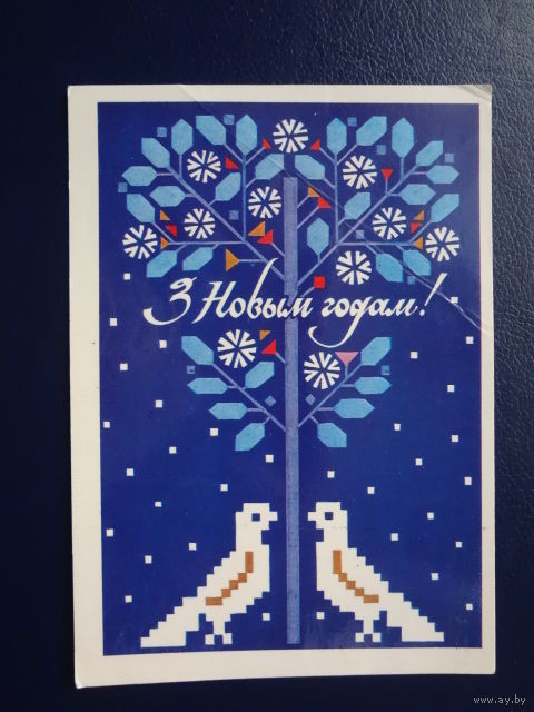 З Новым годам! 1986 г. Дерево, птицы. подписанная.