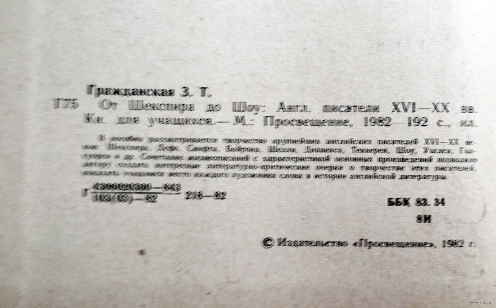 отзыв в интернете: Наткнувшись на эту книгу, отнёсся к ней с некоторой осторожностью. Анализ творчества ведущих английских литераторов на протяжении целых четырёхсот лет с лёгкостью мог свести «От Шекспира до Шоу» - к простой энциклопедии, тем более что сам автор Зоя Гражданская позиционировала её как книгу для учащихся. К счастью, я оказался неправ.