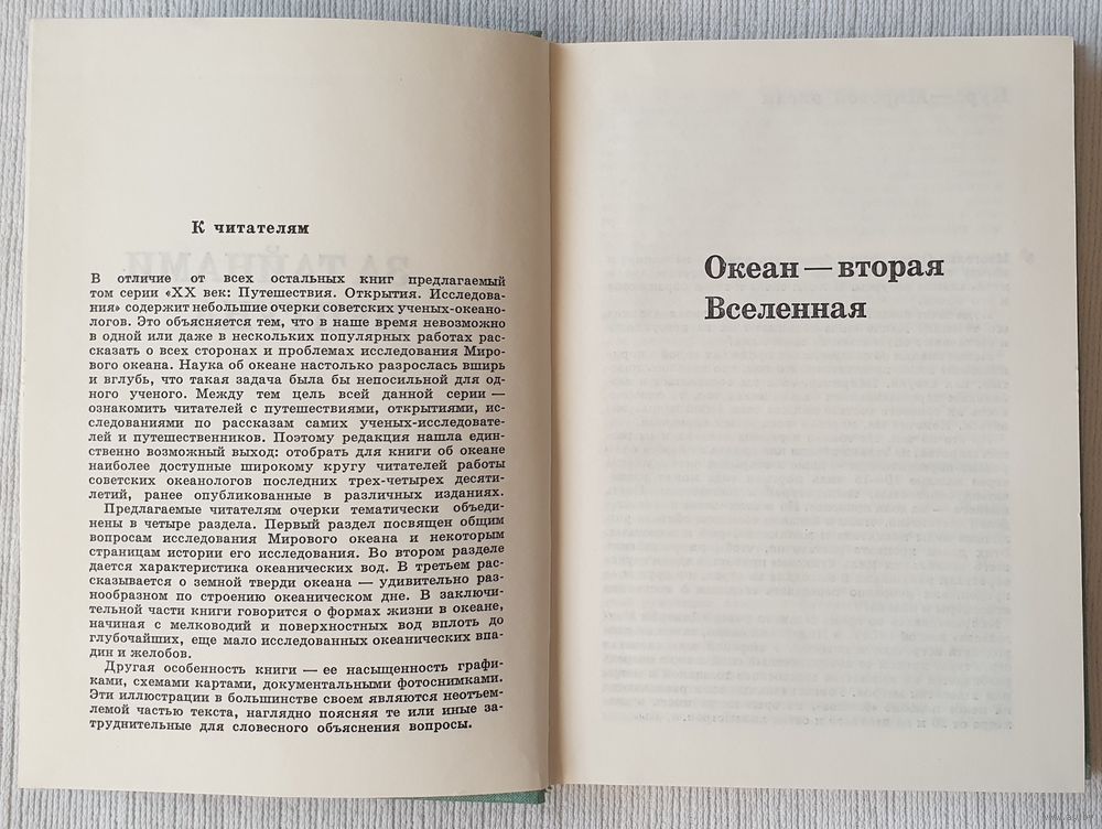 Книга состоит из четырех тематических разделов: общие вопросы исследования океана, характеристика его вод, дна, жизни в океане.