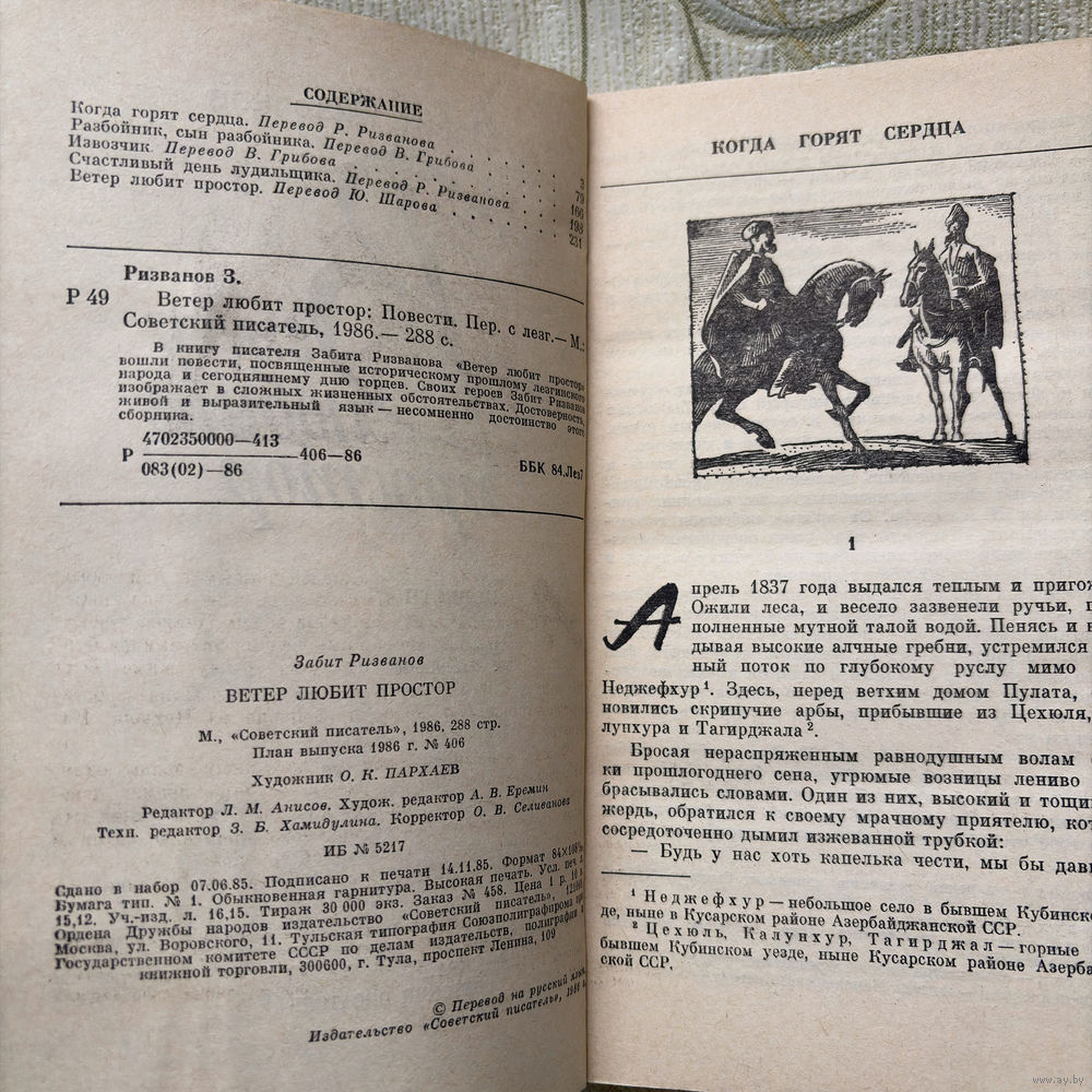 Ветер любит простор: Повести. Пер. с лезг.- М Советский писатель, 1986. - 288 с.В книгу писателя Забита Ризванова «Ветер любит простор вошли повести, посвященные историческому прошлому лезгинсокго народа и сегодняшнему дню горцев, Своих героев Забит Ризванов изображает в сложных жизненных обстоятельствах. Достоверность живой и выразительный язык - несомненно достоинство сборника.