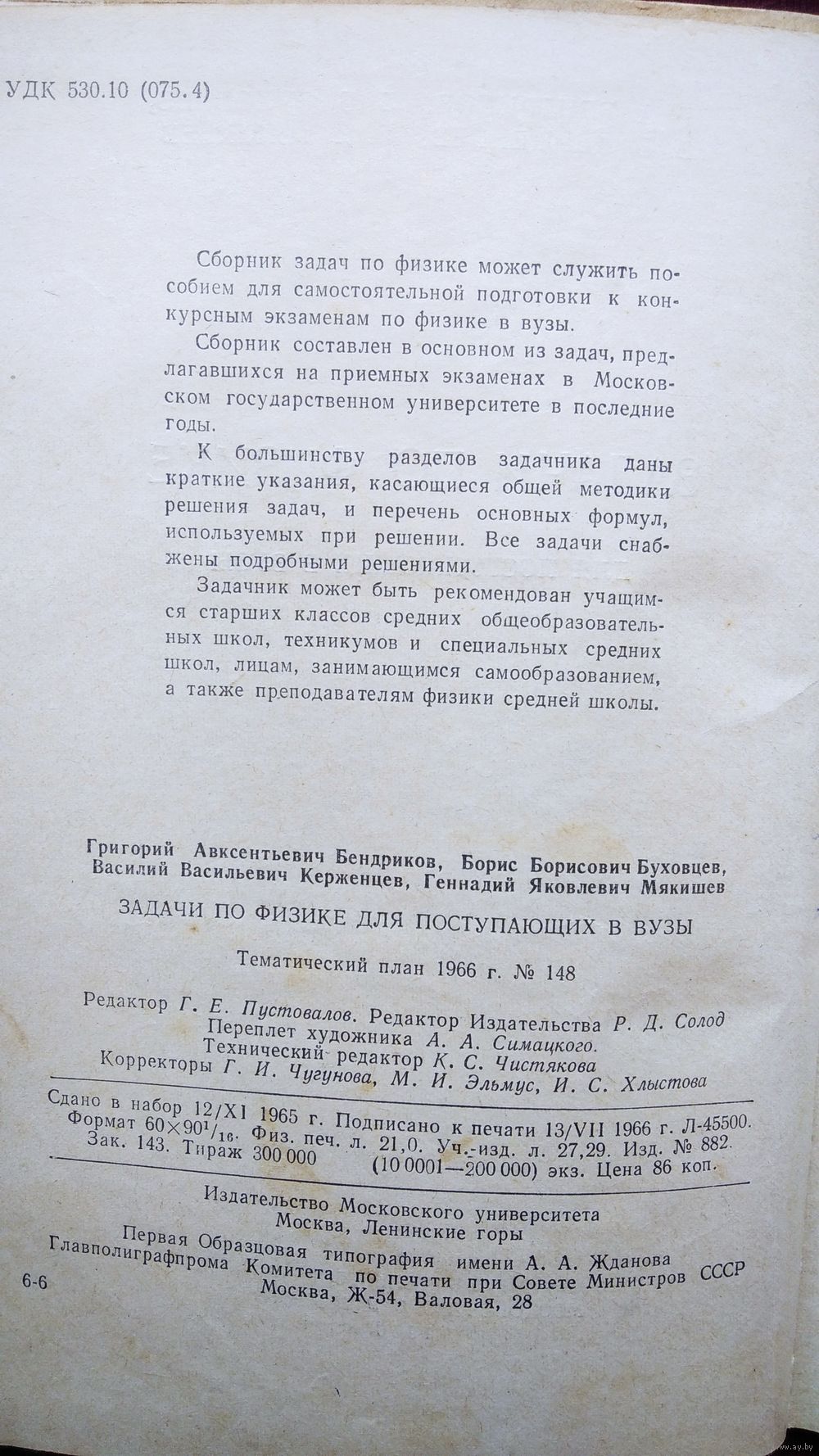 В книге, помещены в основном задачи, предлагавшиеся на приемных экзаменах по физике в Московском государственном университете. К каждой теме задачника даны краткие указания, касающиеся общей методики решения задач, и основные формулы, используемые при решении. Все задачи снабжены подробными решениями.