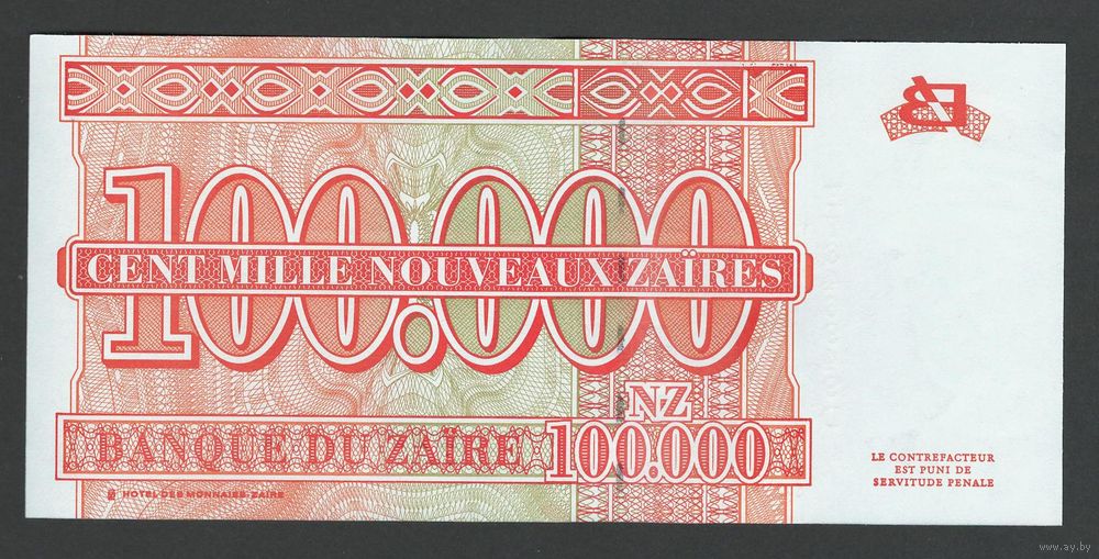 Заир 100000 заир 1996 года. Тип P-77. Состояние UNC