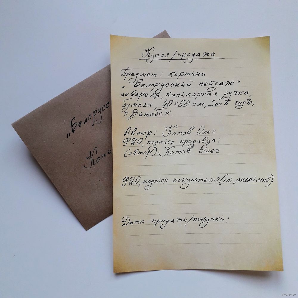 С работой даётся бумага о купле/продаже. Во избежании в дальнейшем у покупателя недоразумений: "Откуда взял, и оригинальная ли." Фото бумаги для примера прилагается.