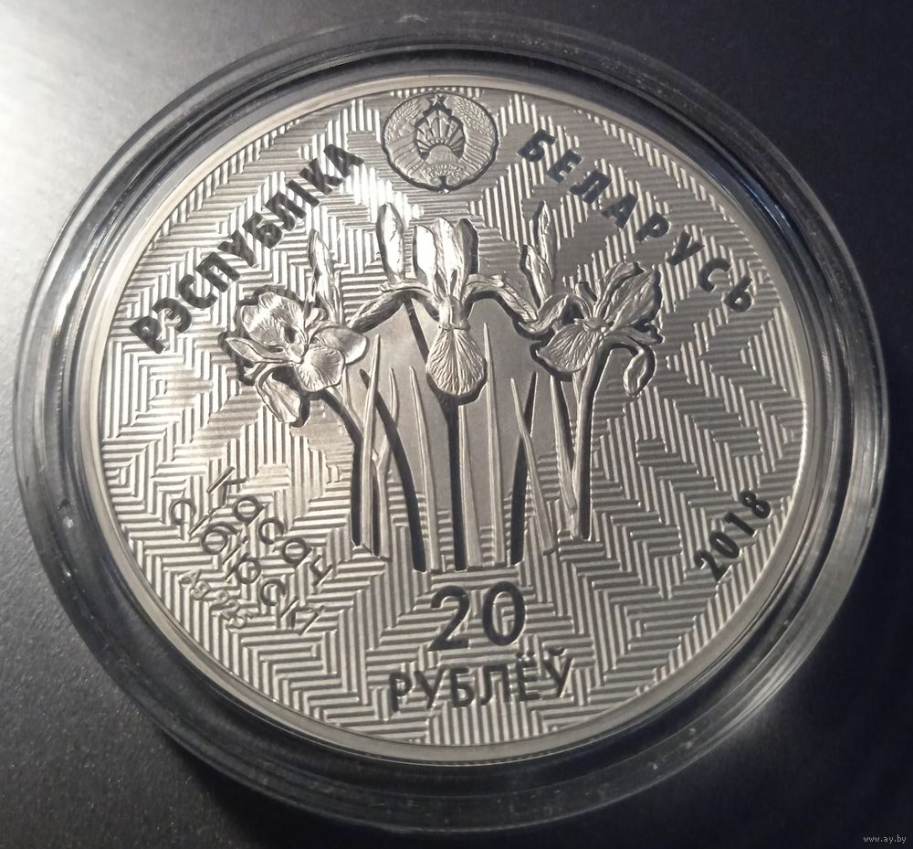 на фоне орнаментального полотна расположены: вверху – рельефное изображение Государственного герба Республики Беларусь и надпись: РЭСПУБЛІКА БЕЛАРУСЬ; в центре – изображение цветущего растения; под ним номинал: 20 РУБЛЁЎ (на серебряной); слева надпись: КАСАЧ СІБІРСКІ и проба сплава (на серебряной); справа – год чеканки.