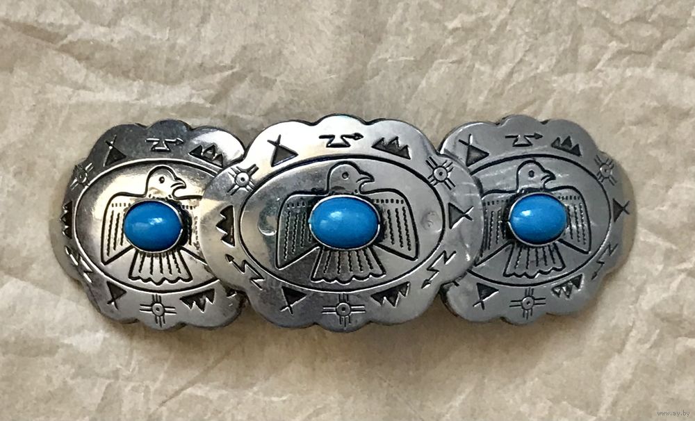 Крупная эффектная заколка-автомат в стиле мастеров племени Navajo. Основа выполнена из металла под серебро, вставки из плотного пластика под бирюзу. Размер 9,5х3,5см. Состояние хорошее.
