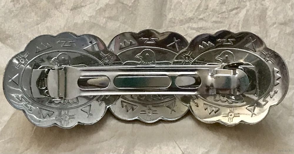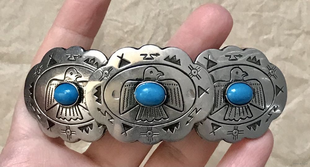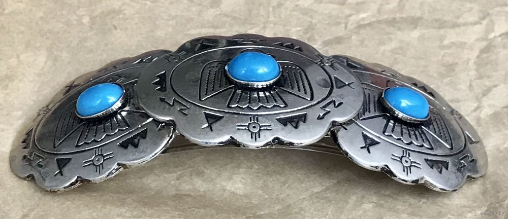 Крупная эффектная заколка-автомат в стиле мастеров племени Navajo. Основа выполнена из металла под серебро, вставки из плотного пластика под бирюзу. Размер 9,5х3,5см. Состояние хорошее.