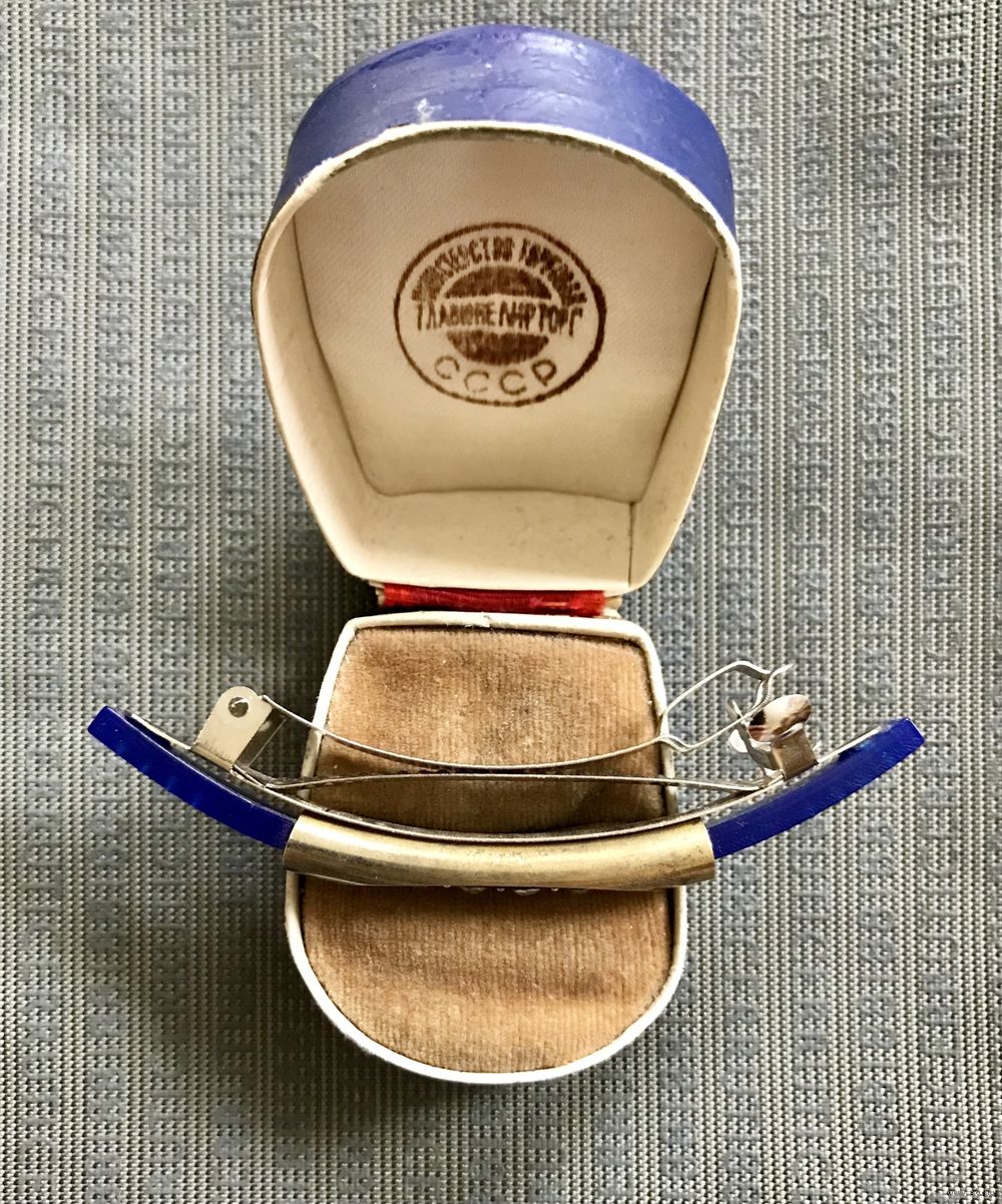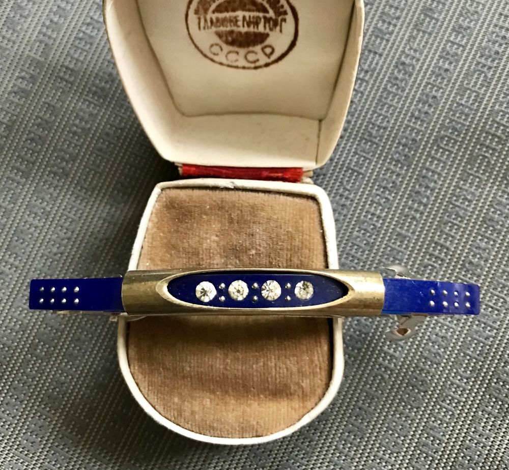 Заколка-автомат для волос с основой из металла серебристого тона, лицевая сторона украшена пластиной из пластика и кристаллами. Размер 8х0,5см. Состояние хорошее.