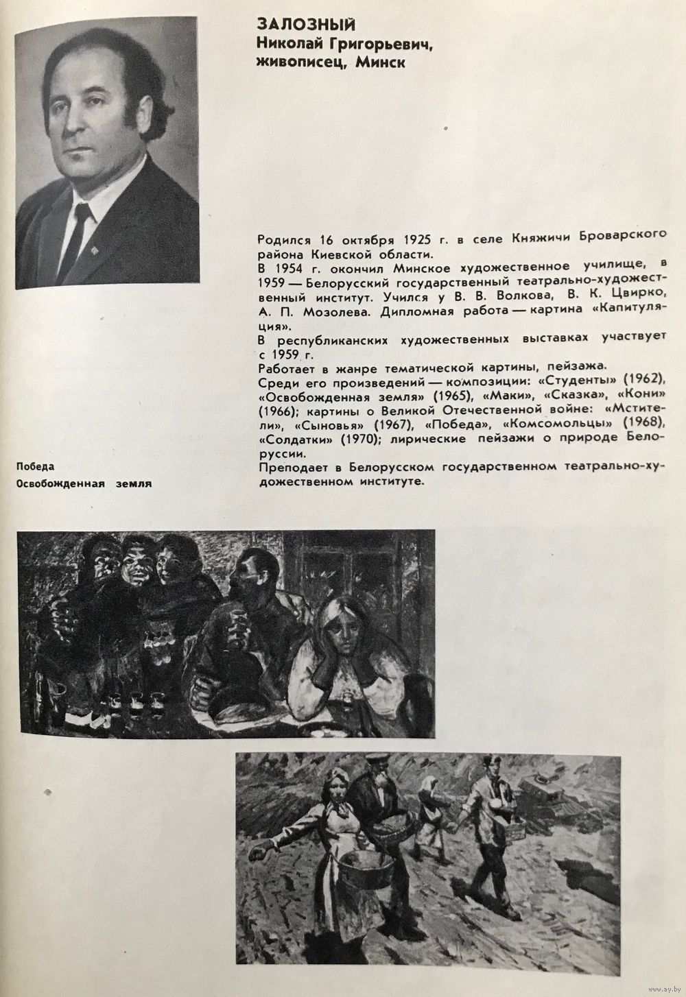 Николай Григорьевич Залозный (16 октября 1925 — 7 апреля 1982) — советский художник украинского происхождения. Родился в селе Княжичи, Киевская область в семье Григория Ивановича Залозного. В 1954 году окончил Минское художественное училище, а в 1959 — Белорусский театрально-художественный институт. Его учителями были В. Волков, А. Мазалев, В. Цвирка. Участник выставок с 1959 года. Работал в стиле станковой живописи. Основными работами являются: «Студенты», «Сказка», «Маки». Преподавал в Минском художественном училище (1960—1971) и Белорусском театрально-художественном институте (1971—1982). Его произведения хранятся в Национальном художественном музее Беларуси и в музее современного искусства в Минске. Дочь Николая Залозного, Наталья, пошла по стопам отца, также занявшись живописью, проживает в Бельгии.