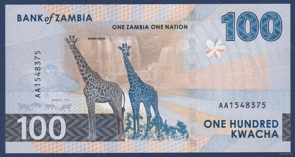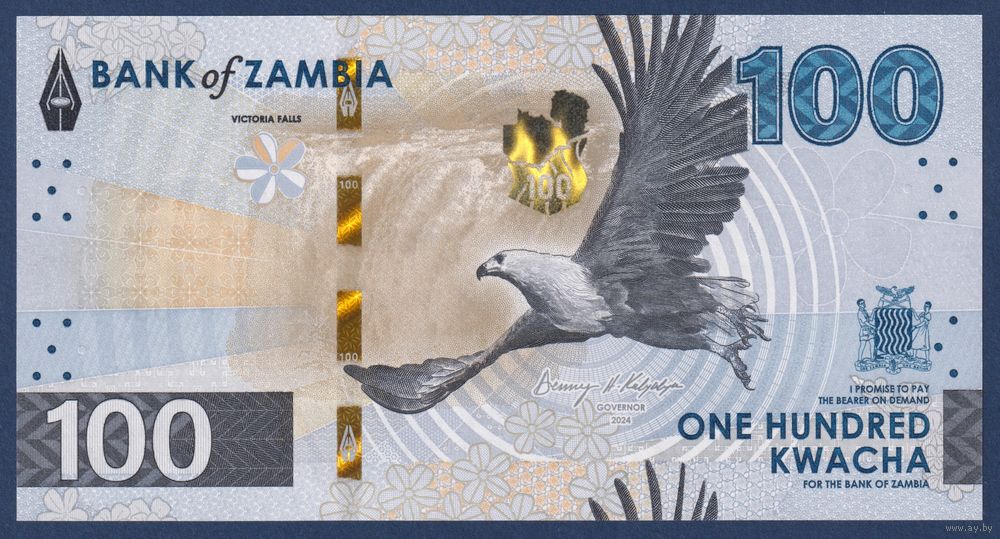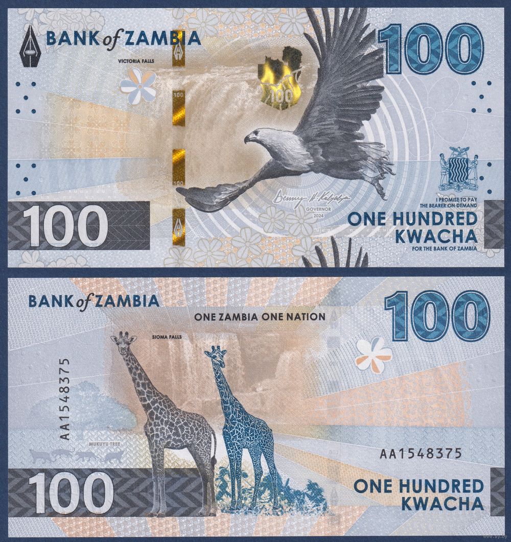 Замбия, 100 квача 2024 г, P-W65 (AA, номинация IBNS 2025, орлан-рыболов, водопад Виктория, жирафы), UNC