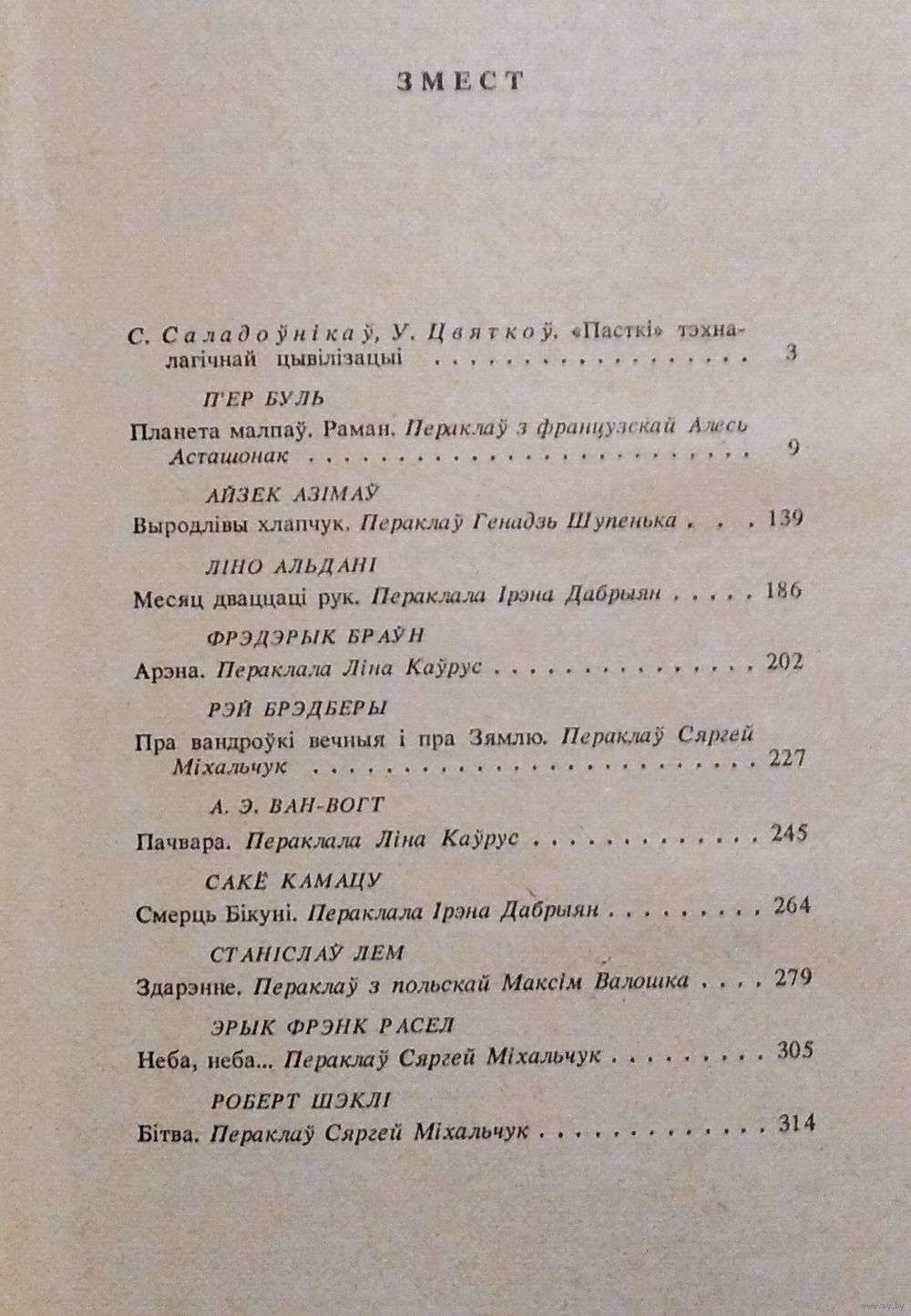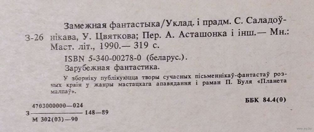 Замежная фантастыка: зборнік. Пераклады з французскай, англійскай, італьянскай, японскай, польскай. Укладанне і прадмова С. Саладоўнікава і У. Цвяткова. Мінск : Мастацкая літаратура, 1990 г. 317 с. Цверды пераплет