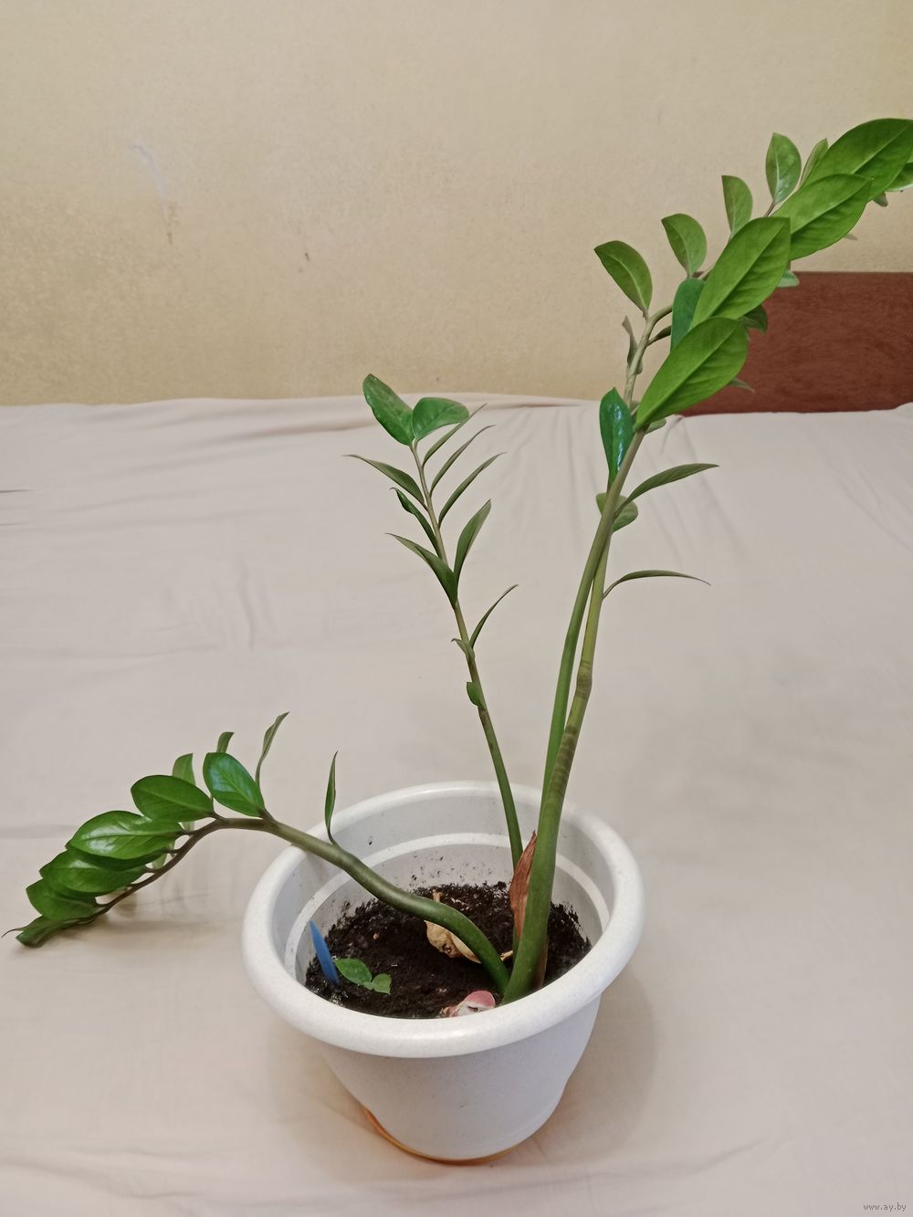 Цветок Замиокулькас, взрослый. Четыре ствола, в том же горшке малыш-одногодка. Максимальная высота цветка (от земли в горшке) почти 70 см. Ширина горшка – 30 см (продаю вместе с ним).