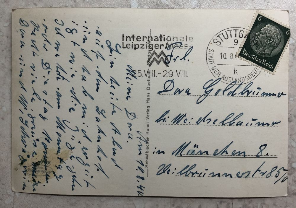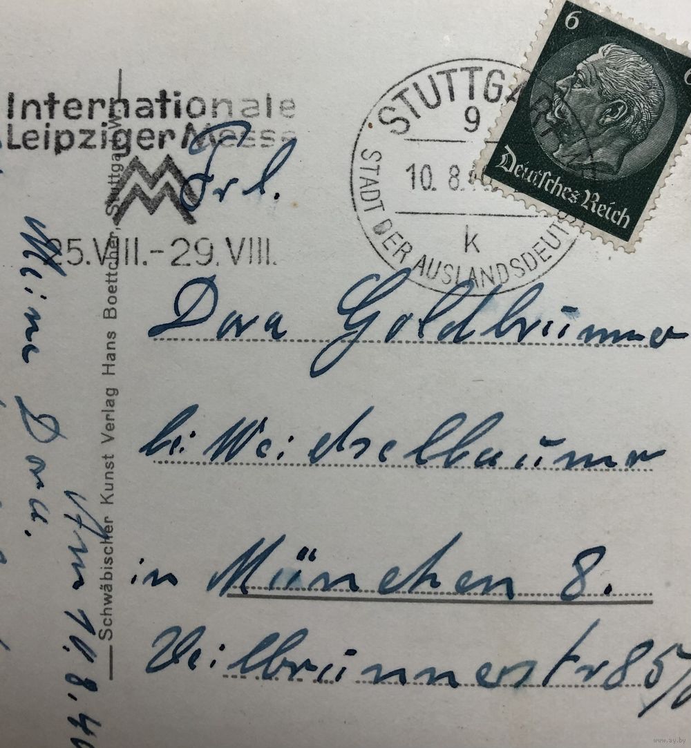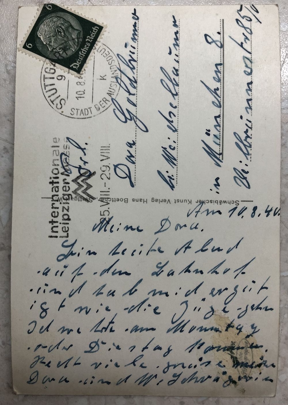 открытка на чёрно-белой фотобумаге, штемпель Лейпцигской международной ярмарки 25.08-29.08, 1940 г., 9.2х13.8 см