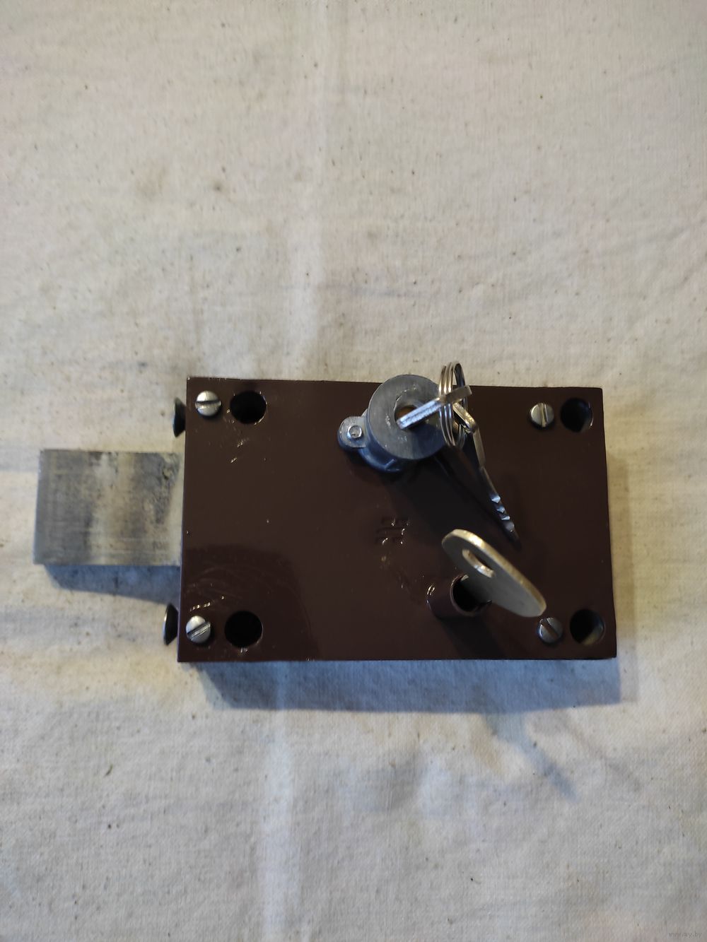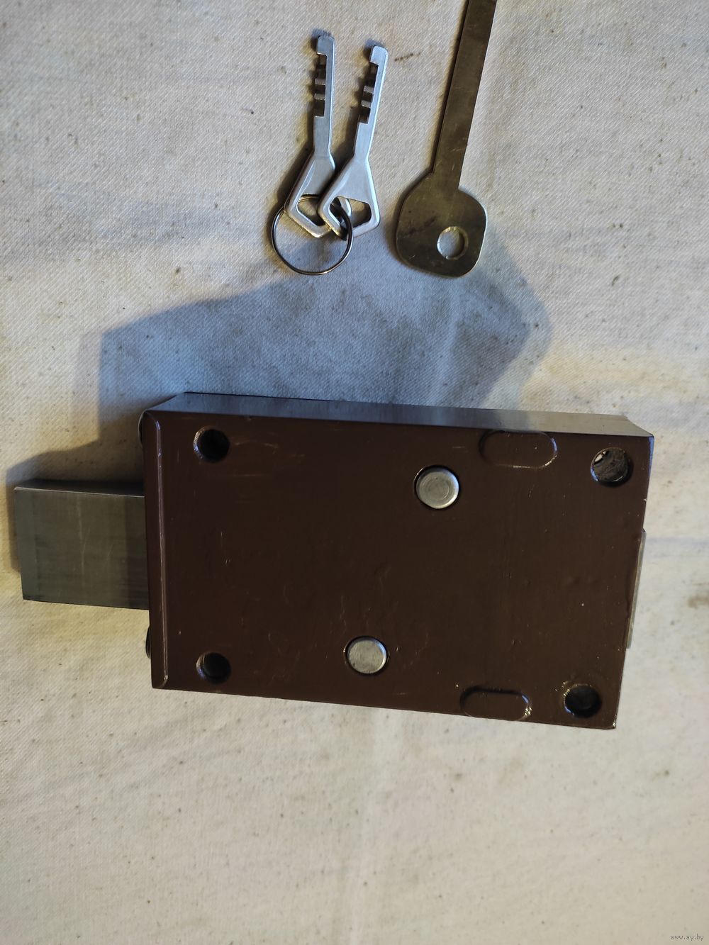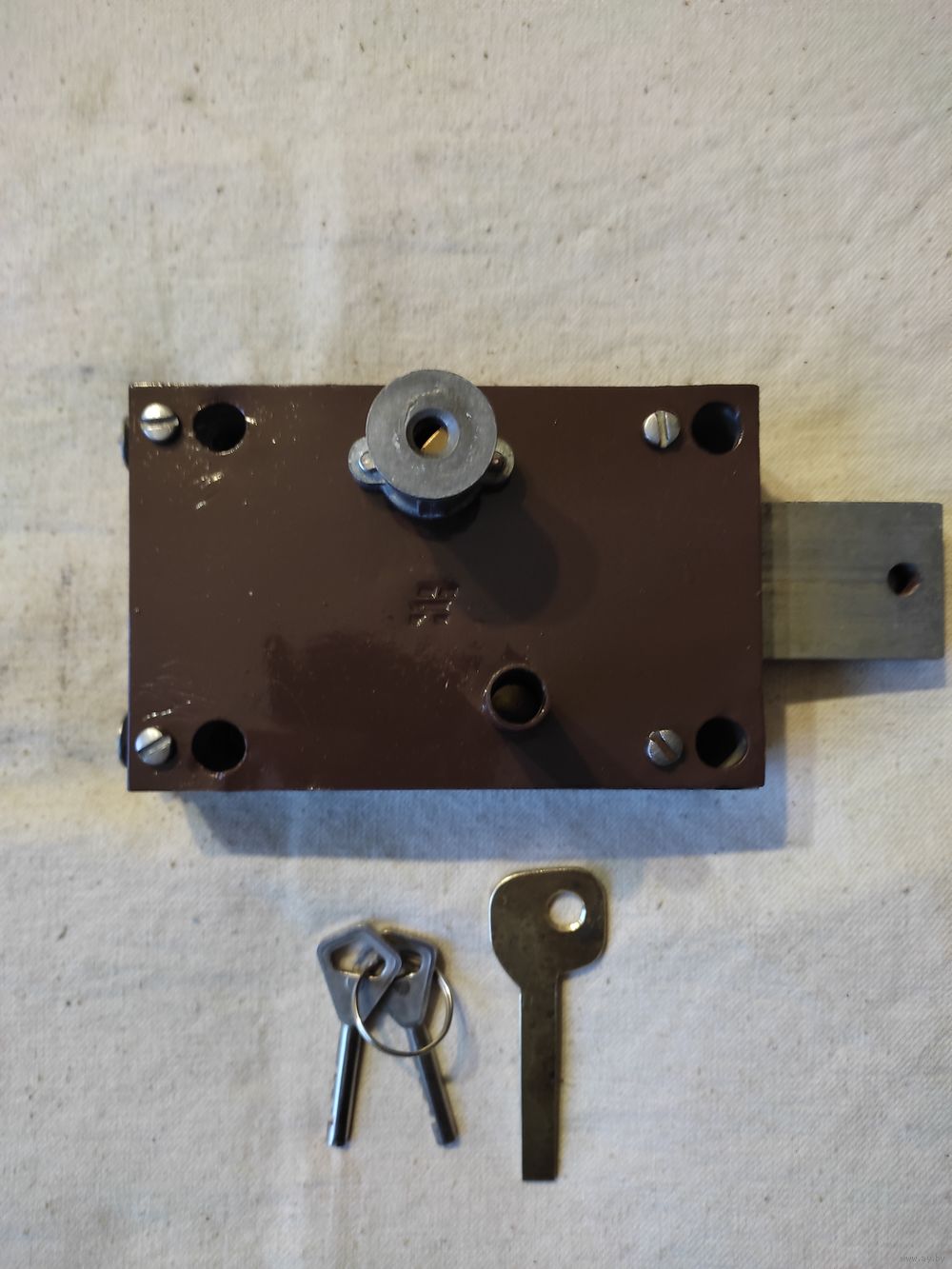 Замок гаражный , 2 ключа. Полная реставрация и восстановление , аккуратно окрашен. Сам замок и сердцевина смазаны. Работает отлично. Размеры замка : длина - 14 см , ширина - 9 см. Крепежные отверстия : по горизонтали - 11 см , по вертикали - 7 см. Высылаю : Белпочта , Европочта.