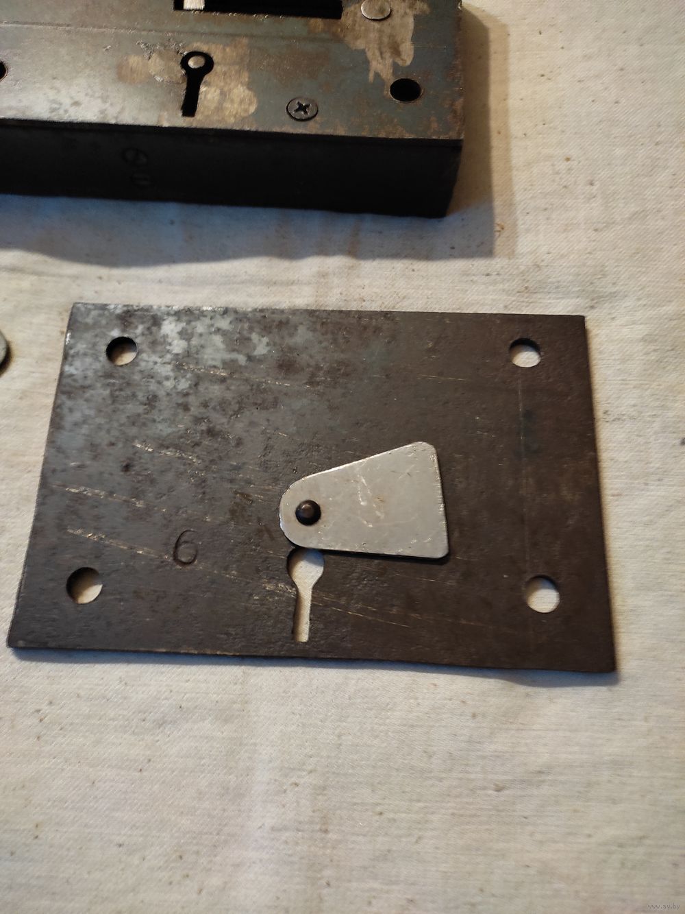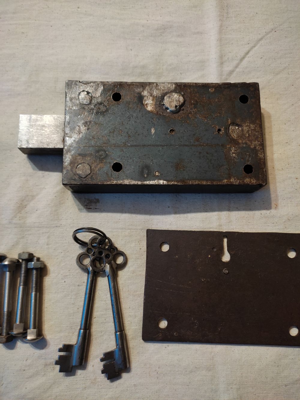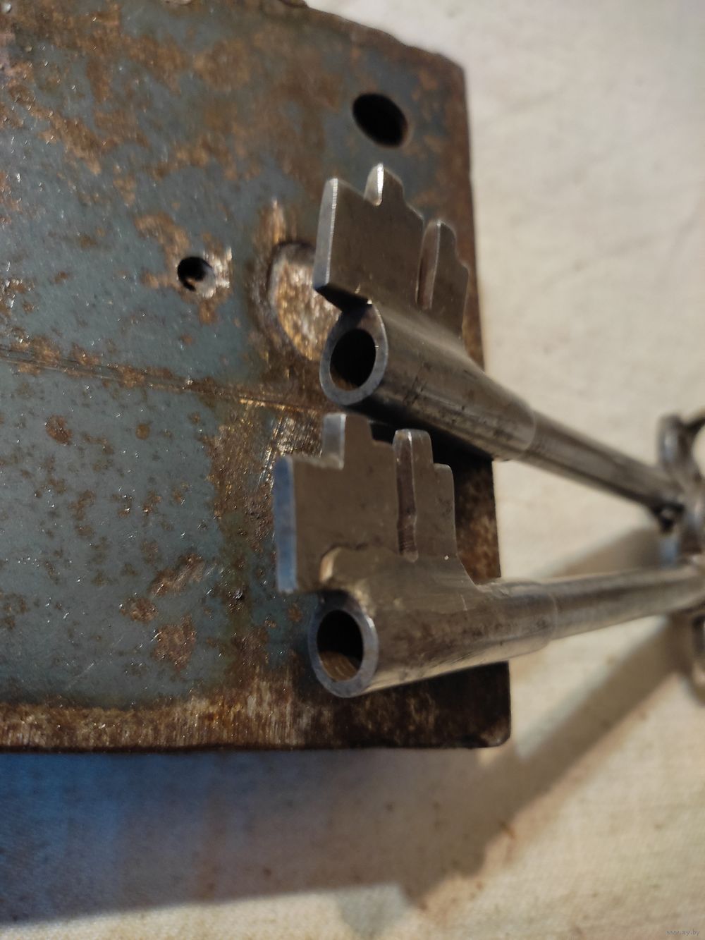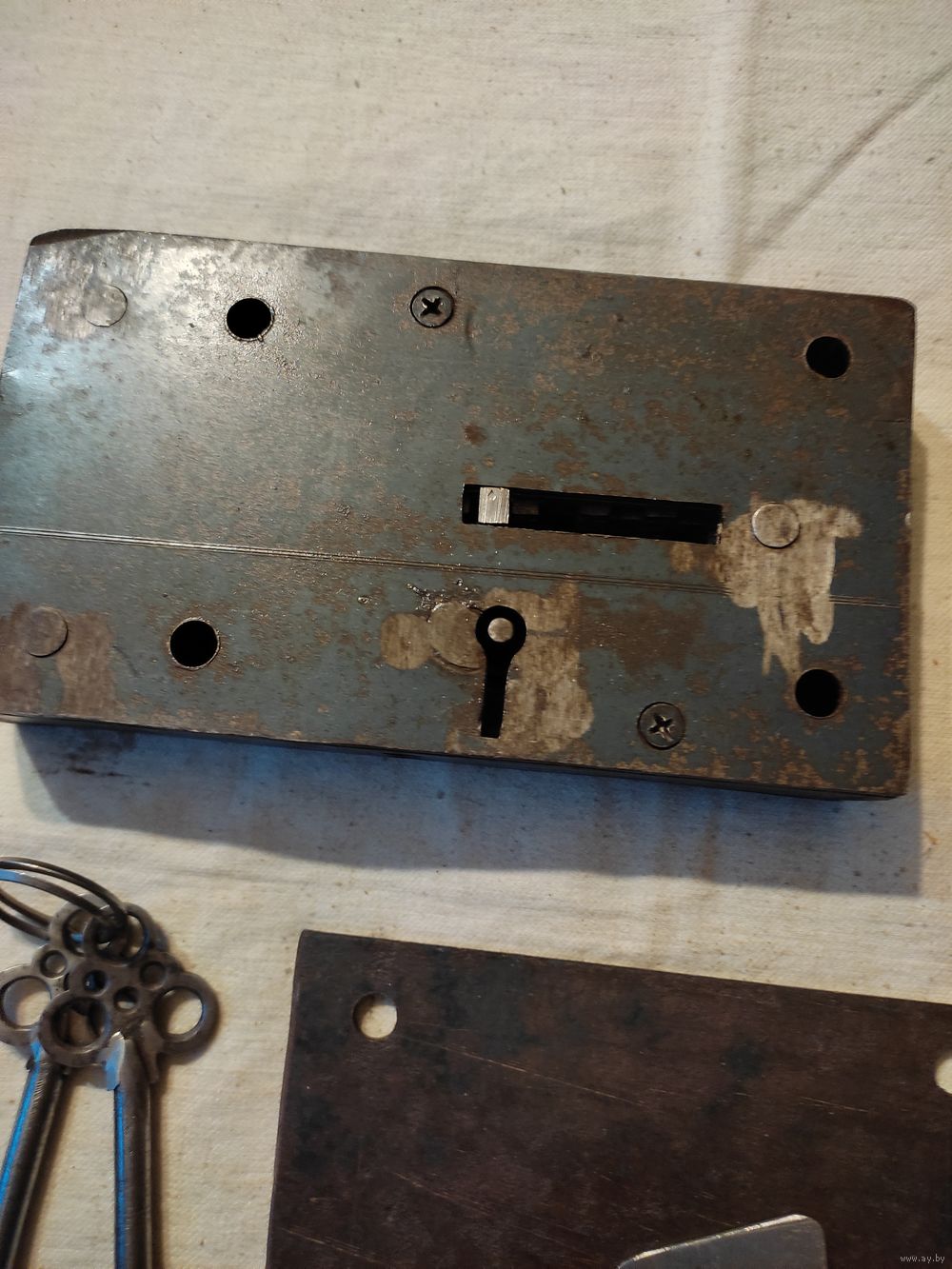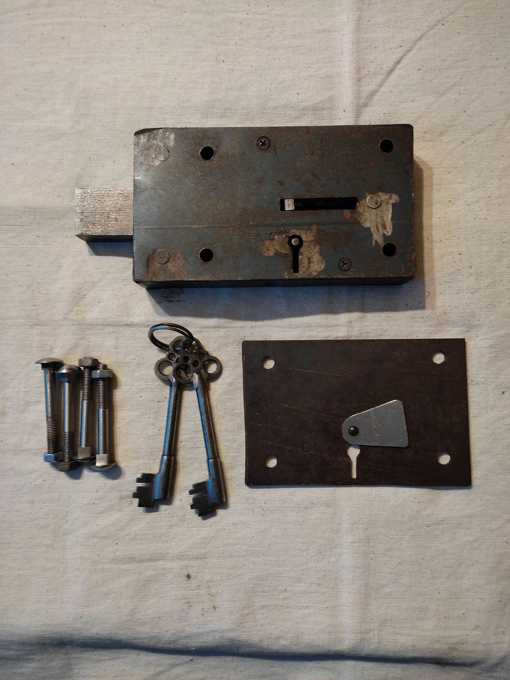Замок гаражный СССР , большой , очень мощный , 2 ключа. Уникальная самоделка СССР ( делал исключительно опытный мастер ) . Вес замка с ключами - 3 кг 336 гр. Размеры замка : длина - 20 см , ширина - 11 см , толщина - 3,5 см. Крепежные отверстия : по горизонтали - 13 см , по вертикали - 7,5 см. Закрывает на 3 оборота ключа. Длина ключа - 13 см. Полностью вычищен и обслужен ( внутри смазан смесью пушсала с машинным маслом ) , работает отлично. Новый , на воротах не стоял. Есть 4 крепежных болта. Отличная , мощная вещь СССР ! Высылаю : Белпочта , Европочта.