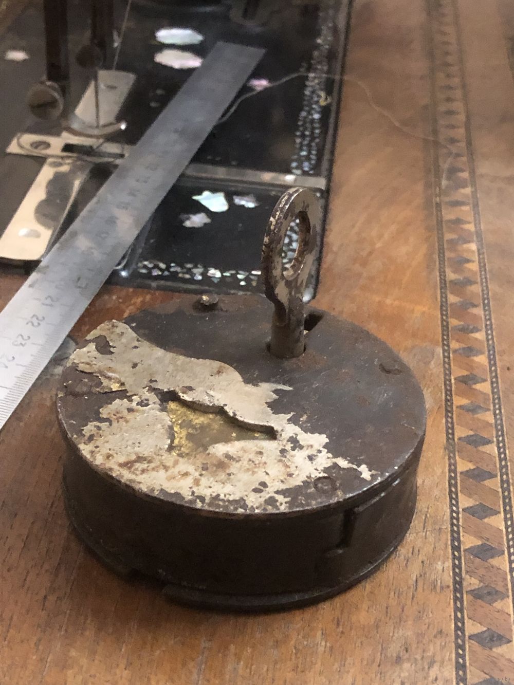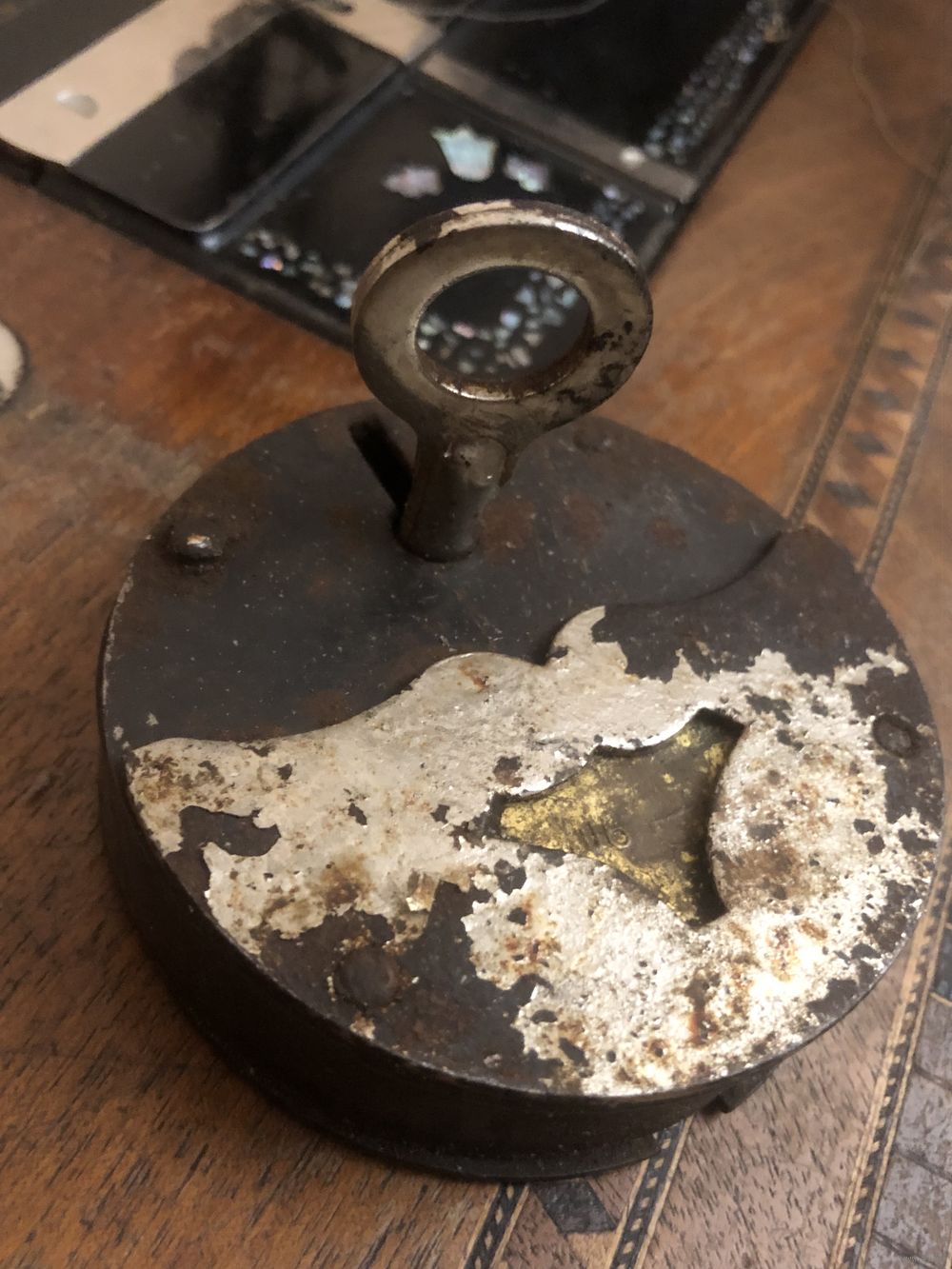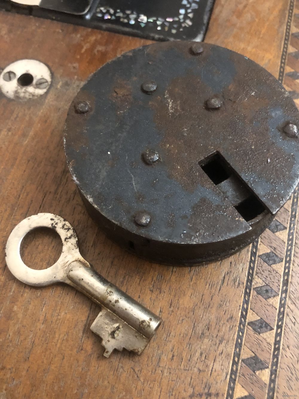 Интересный старый навесной замок. Полностью рабочий без нюансов. Есть клеймо. Ключ родной.