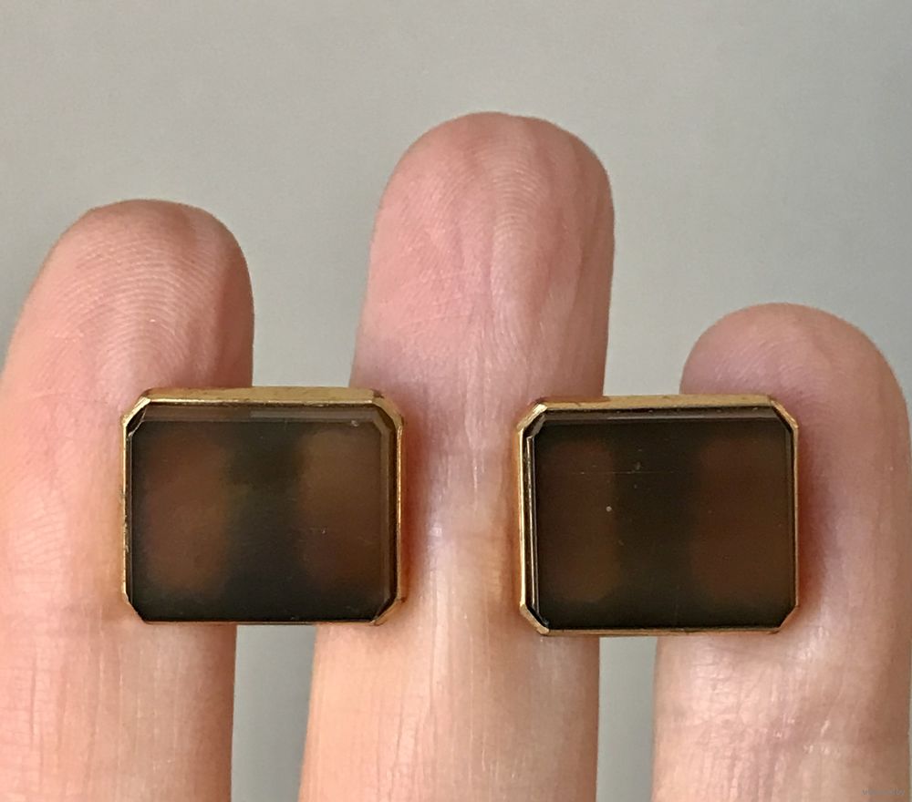 Запонки с основой из латуни с позолотой и вставками из нат.камня. Сделаны а 1958г. на заводе «Русские самоцветы» в г. Ленинграде (именник РС8М). Размер шляпки 1,6х1,3см. На металле местами незначительные потемнения.
