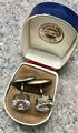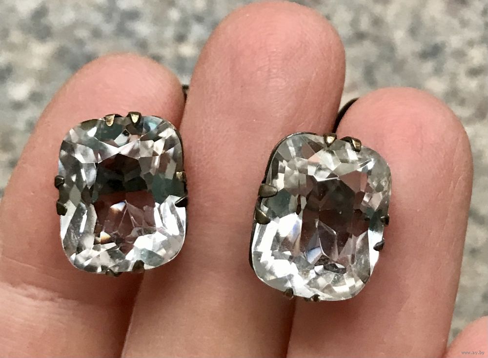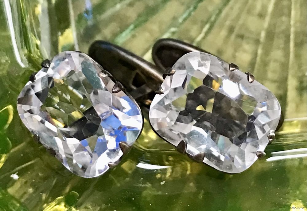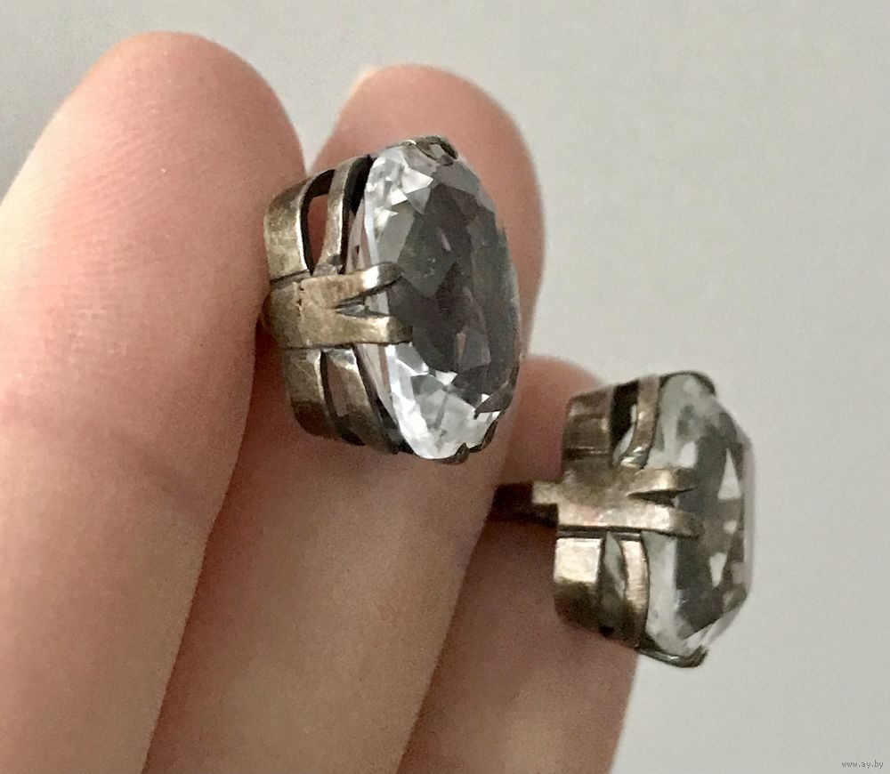 Крупные запонки из серебра 875пр. с позолотой и вставками из горного хрусталя. Сделаны в 1973г. на Свердловском юв.заводе. Размер вставок 1,5х1,2см. Вес пары 9,9гр. Состояние хорошее. Можно переделать в серьги.