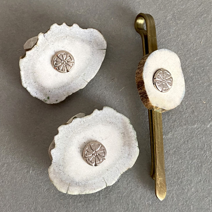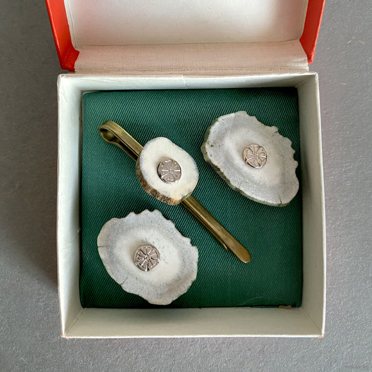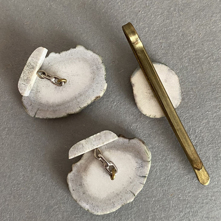 Запонки и зажим для галстука из рога оленя.Сделано в Литовской ССР. 1975 г. Сохранилась родная коробочка и вкладыш. Размер запонок 3,3х2,4 см. Размер зажима 6,3х1,7 см. Состояние отличное. Набором не пользовались.