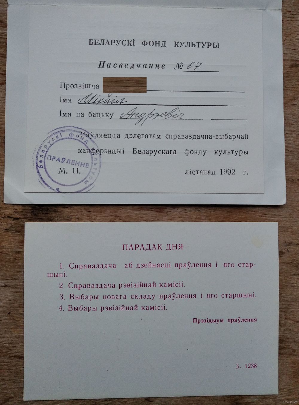 Запрашэнне і пасведчанне дэлегата канферэнцыі Беларускага фонду Культуры. Мінск. 1992 г. Цана за 2.