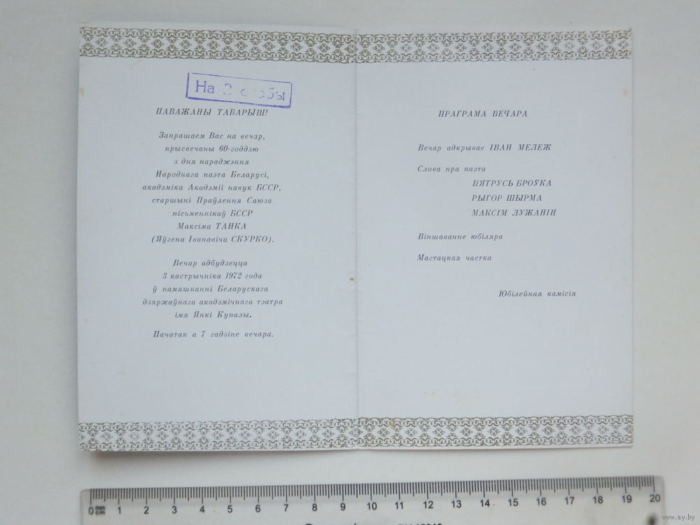 Запрашэнне на вечар Максiма Танка Мiнск 1972