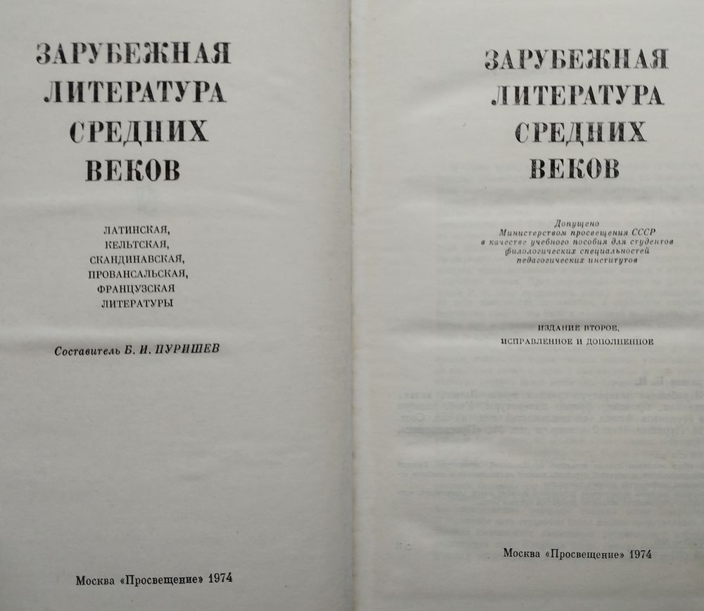 Цена за 2 тома. Большой формат. Тираж 5000 экз. 400+396 стр. Хрестоматия "Зарубежная литература Средних веков", составленная и изданная в 1953 г. выдающимся ученым и педагогом Б.И. Пуришевым (1903—1989) и значительно обновленная и расширенная во втором издании (1974—1975) , остается лучшим учебным изданием такого рода. В книге собраны произведения и фрагменты, позволяющие отчетливо представить пути развития средневековой литературы на протяжении целого тысячелетия, ее направления (рыцарская, клерикальная, городская литература), жанры (от грандиозных произведений героического эпоса до системы лирических жанров, средневековой драматургии). В хрестоматии раскрывается становление фигуры автора в литературном процессе от безымянных сочинителей раннего средневековья до Данте, Чосера и Вийона.
