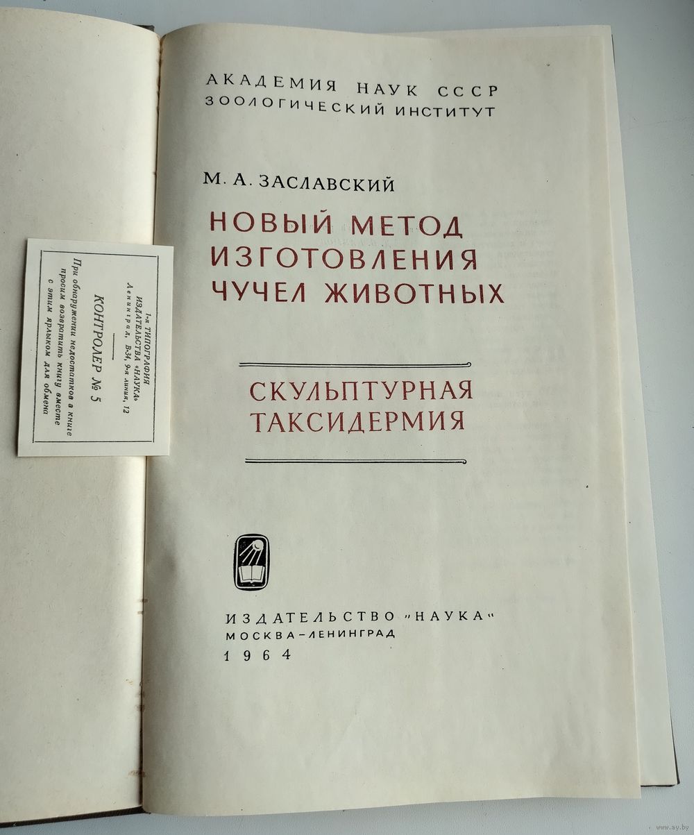Заславский М. А. Новый метод изготовления чучел животных. Скульптурная таксидермия. Академия наук СССР. Зоологический институт. М.- Ленинград: Наука, 1964г., 204 с. Твёрдый переплёт, суперобложка, энциклопедический формат.