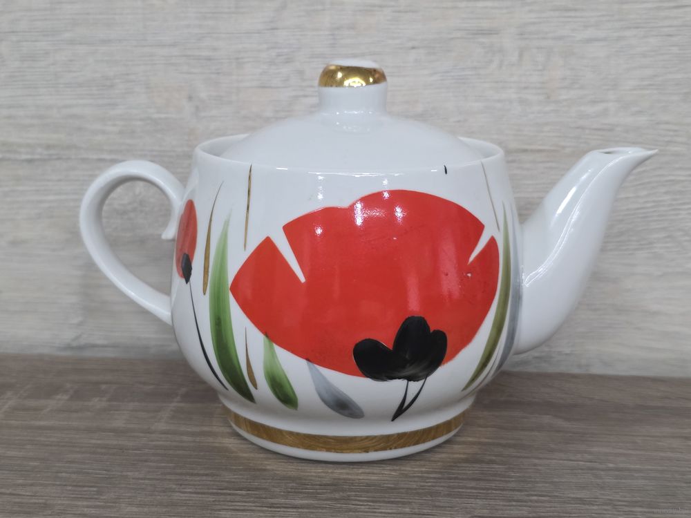 Высота 11,5 см, вся ширина(от кончика носика, до ручки) 18 см. Небольшой , плоский скольчик на носике. В глаза не бросается.