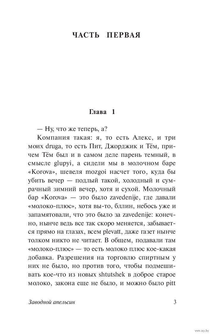 «Заводной апельсин» – литературный парадокс ХХ столетия. Продол-жая футуристические традиции в литературе, экспериментируя с языком, на котором говорит рубежное поколение malltshipalltshikov и kisok «надсатых», Энтони Бёрджесс создает роман, признанный классикой современной литературы. Умный, жестокий, харизматичный антигерой Алекс, лидер уличной банды, проповедуя насилие как высокое искусство жизни, как род наслаждения, попадает в железные тиски новейшей государственной программы по перевоспитанию преступников и сам становится жертвой наси-лия. Можно ли спасти мир от зла, лишая человека воли совершать пос-тупки и превращая его в «заводной апельсин»? Этот вопрос сегодня актуален так же, как и вчера, и вопрос этот автор задает читателю. Теги: Заводной апельсин, Заводной апельсин книга, книга Заводной апельсин, Энтони Берджесс, антиутопия, Мы, 1984, О дивный новый мир, антиутопия книги, эксклюзивная классика, эксклюзивная классика книги, классика, классика книги, книги мировая классика, зарубежная классика