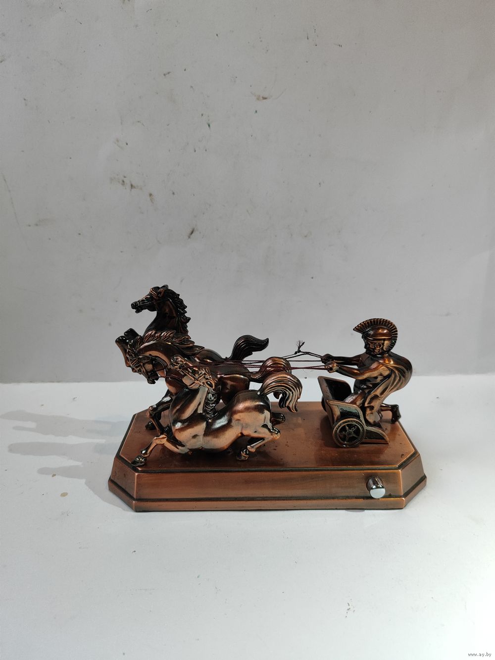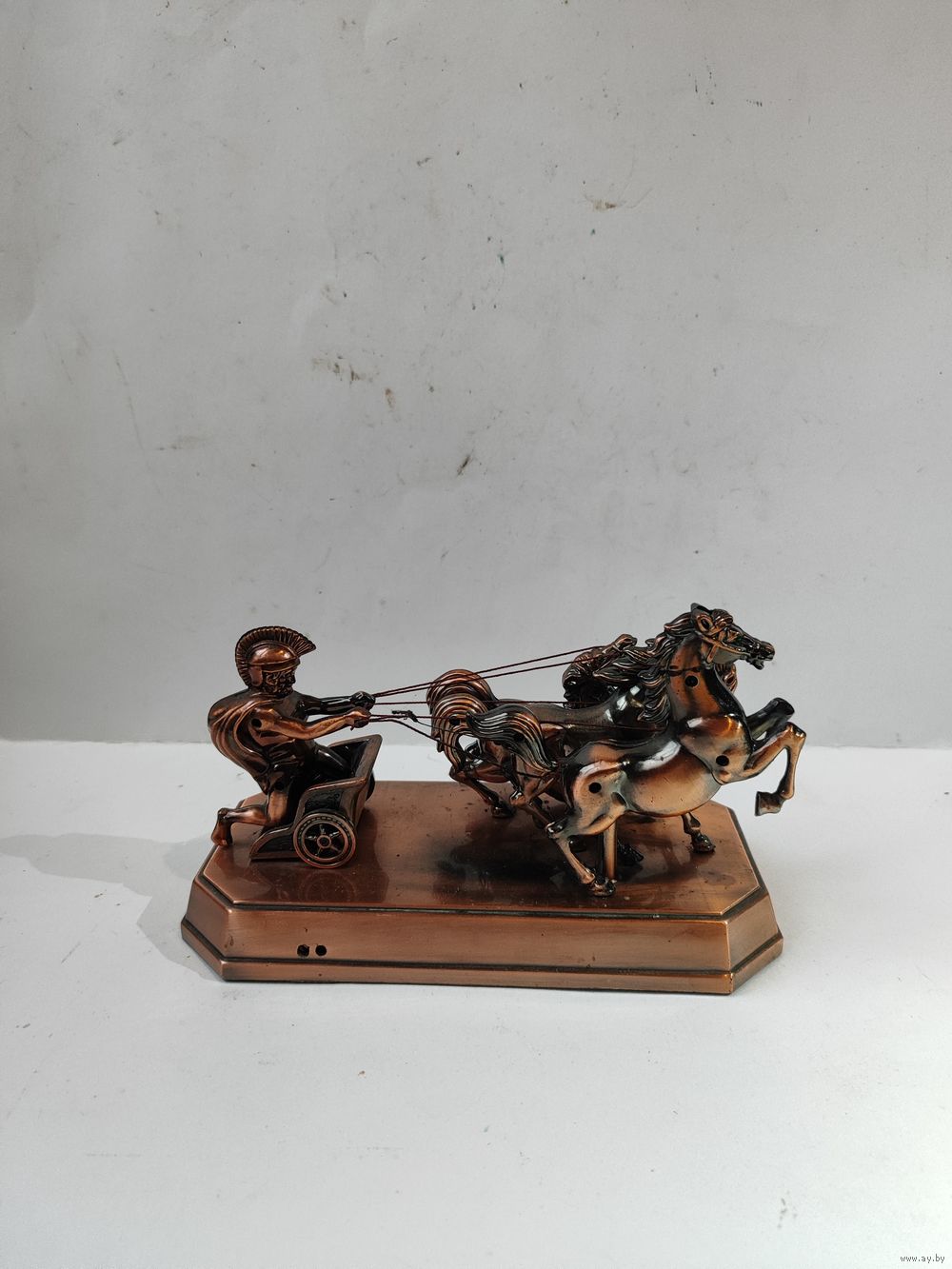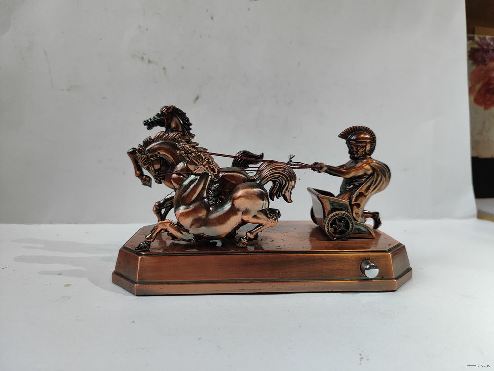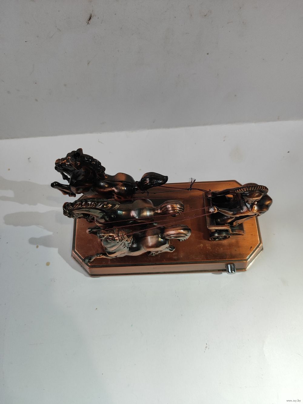 Металлизированный пластик. Не рабочая. Длинна -19 см. Высота -11 см. Состояние на фото.(оборвана одна нить-возжи).