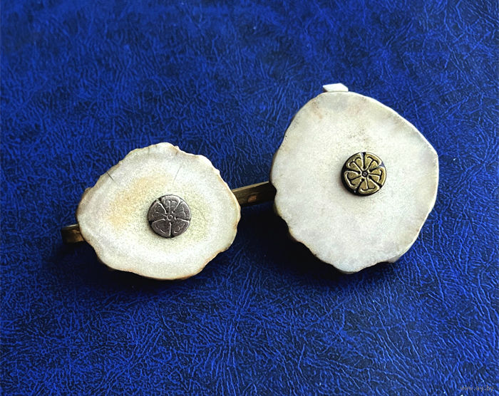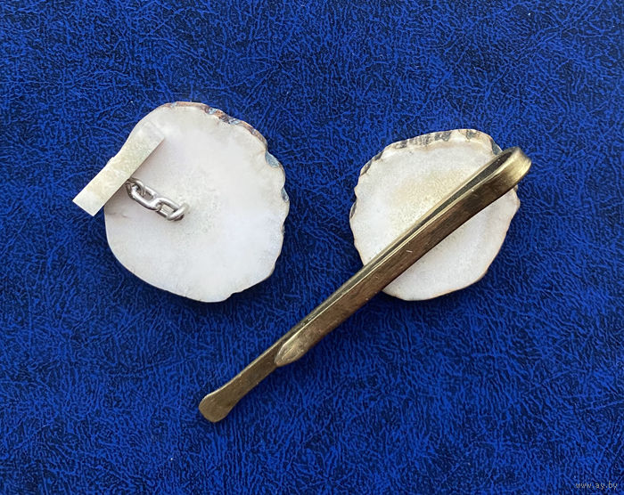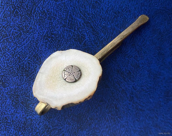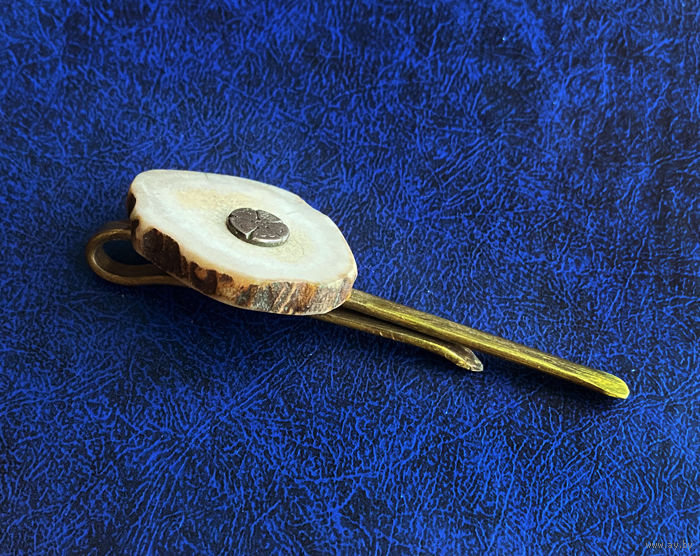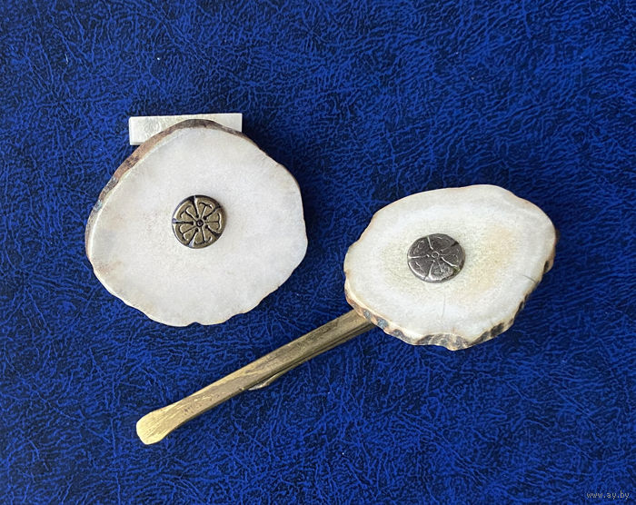 Зажим для галстука из рога северного оленя/марала. Размер пластины 3х2,4 см. Длина металлической заколки 7 см. Украшение в петлицу пиджака из рога северного оленя/марала. Размер 3,8х3,2 см. Состояние отличное.