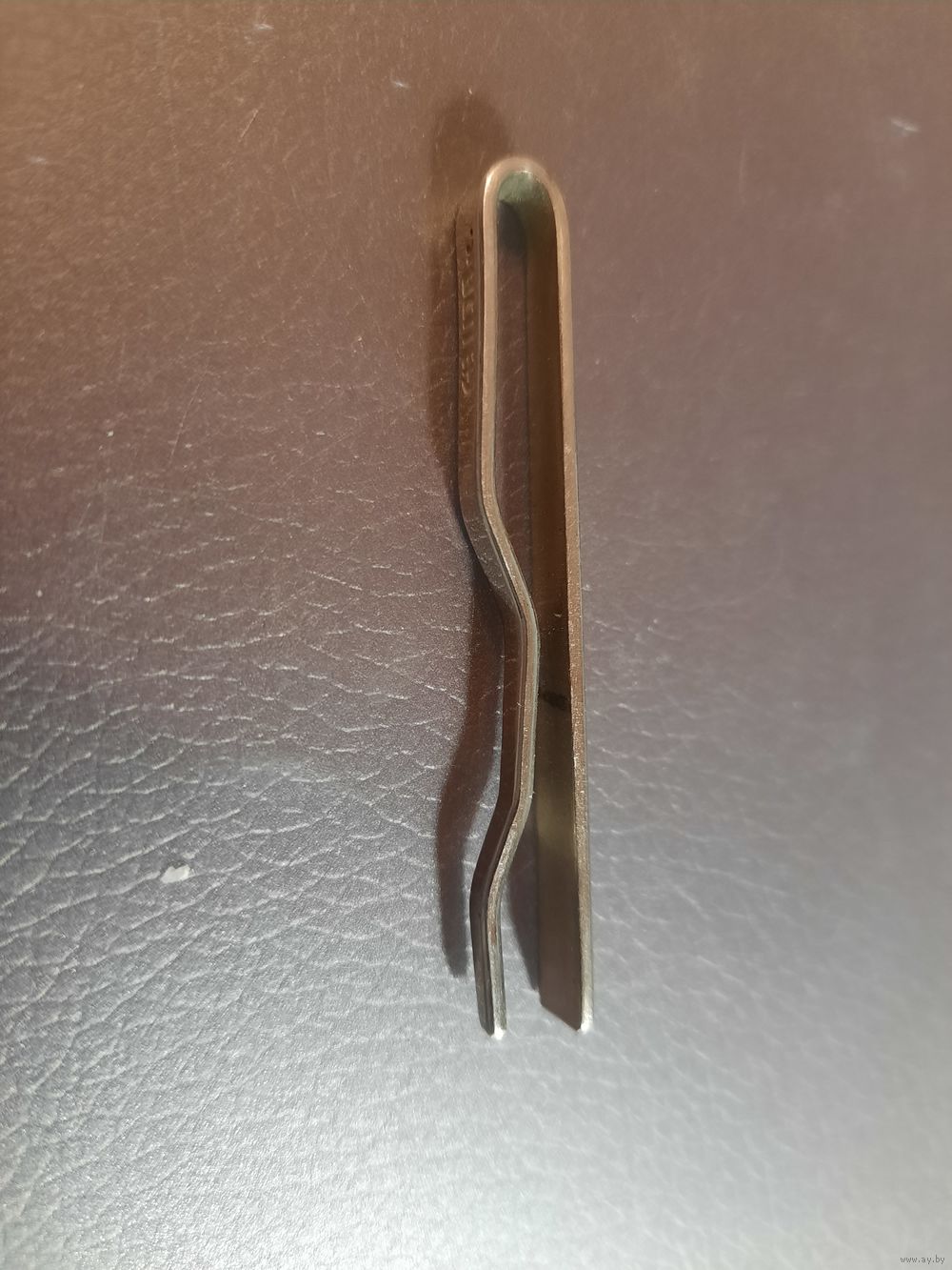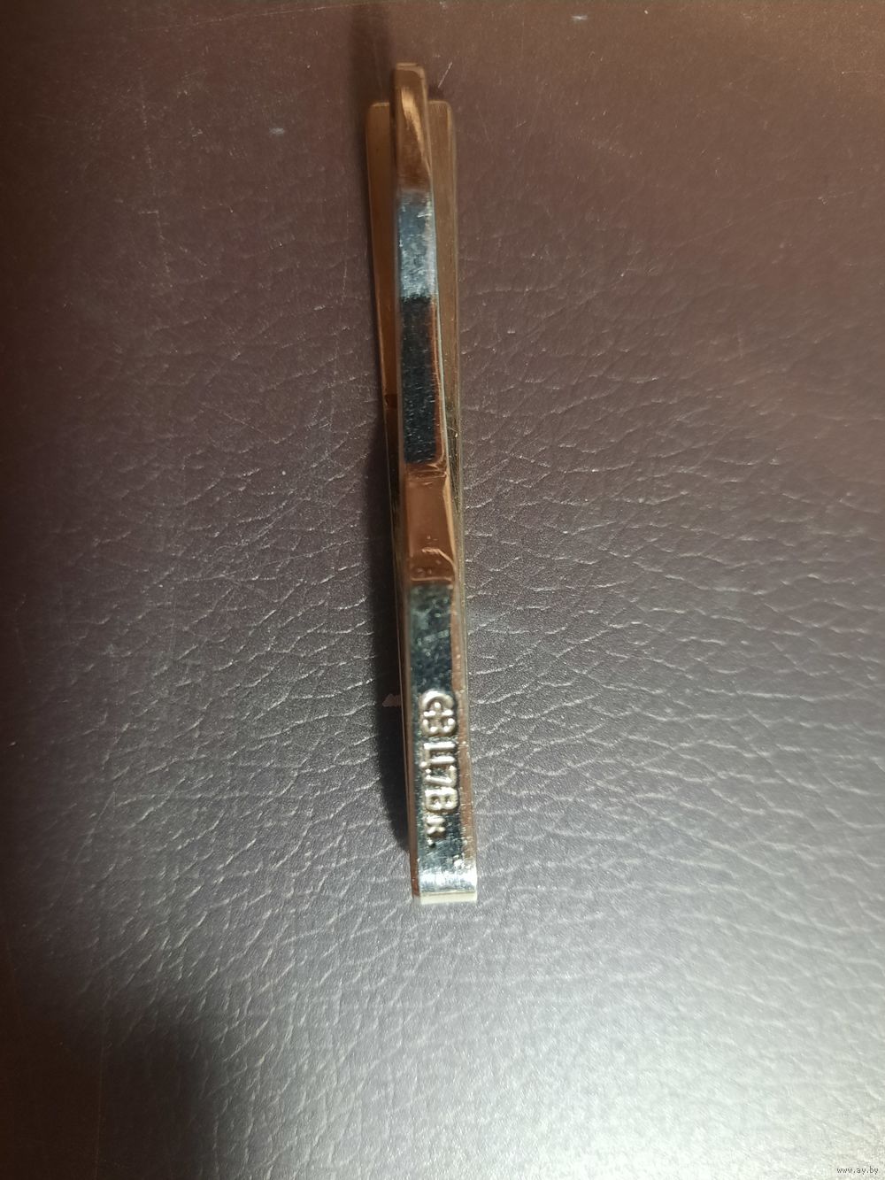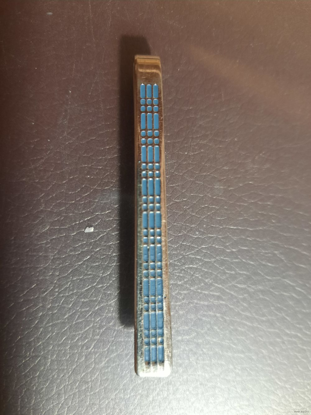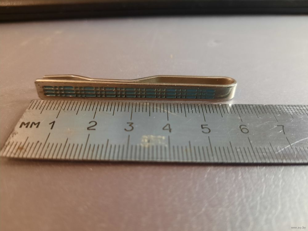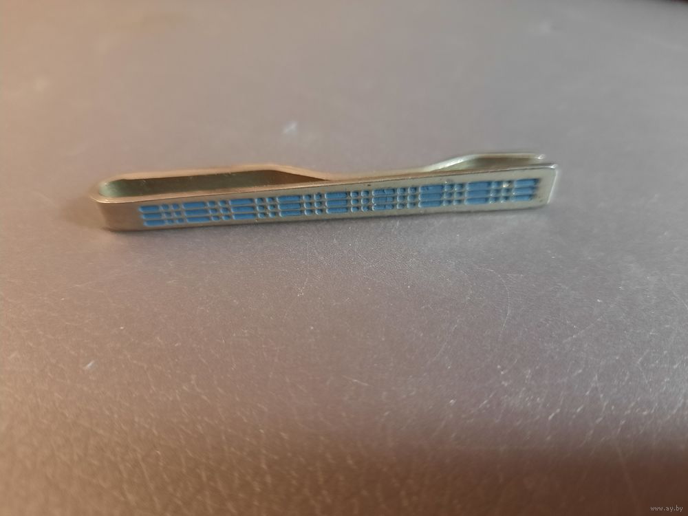 Зажим для галстука винтражный. Металл серебристого тона с узором в клетку голубая эмаль. Стиль популярный в середине 20-го века. Имеется клеймо производителя и цена.