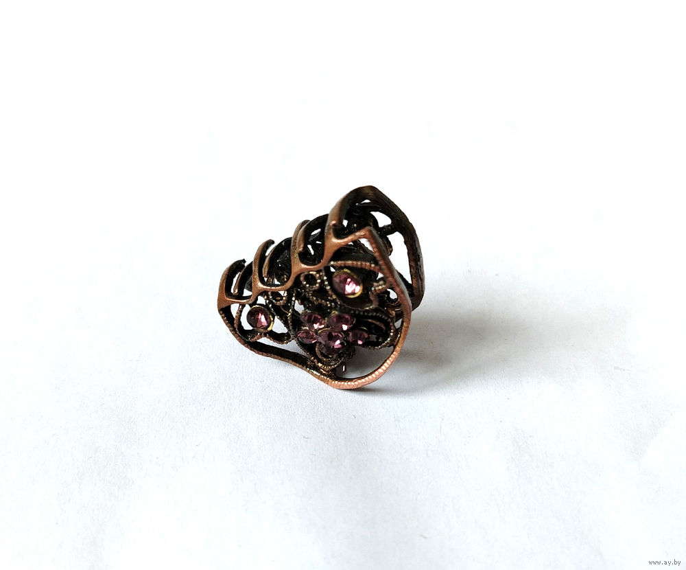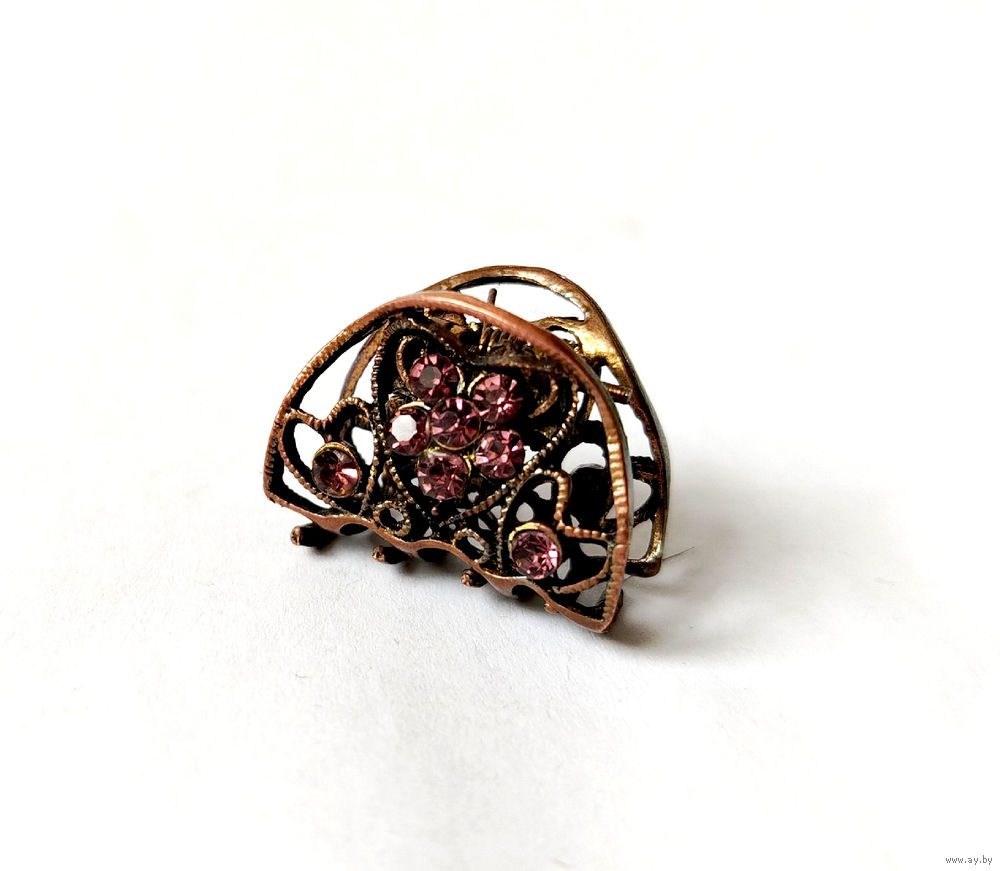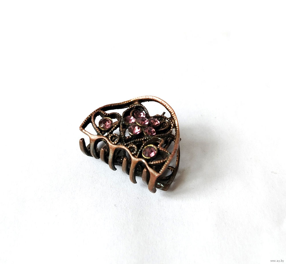 Маленький металлический зажим-крабик для волос, украшенный розовыми стразами. Он выполнен в винтажном или филигранном стиле, имеет медный оттенок и ажурный узор. Изготовлен из бижутерного сплава с покрытием под медь. Декоративный элемент выполнен в виде ажурного цветка или узора, инкрустированного розовыми кристаллами или стразами.