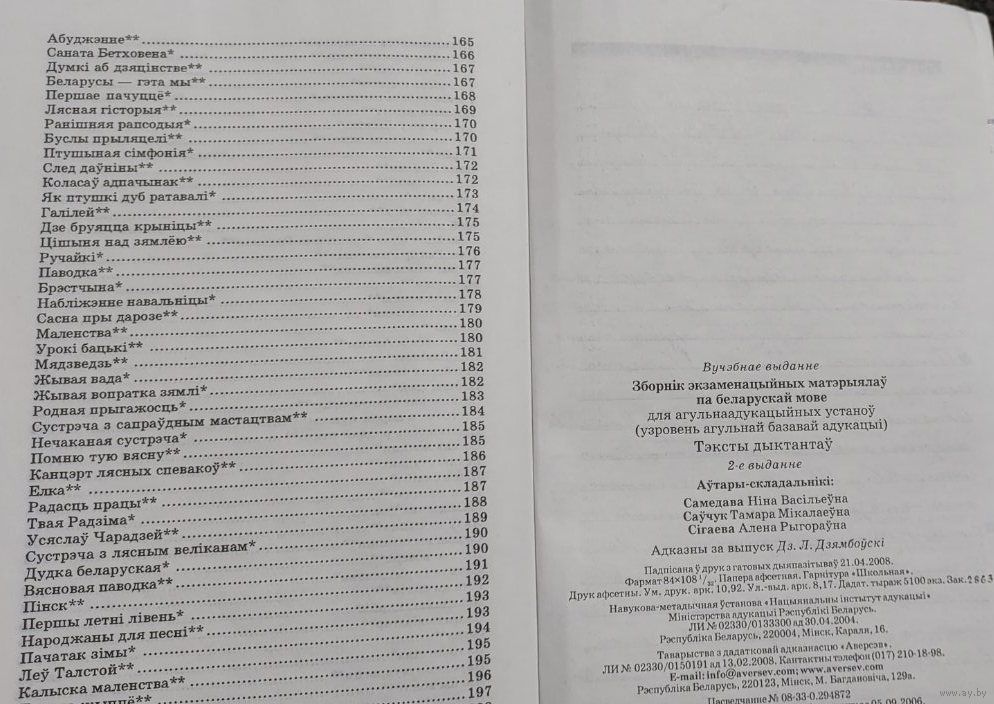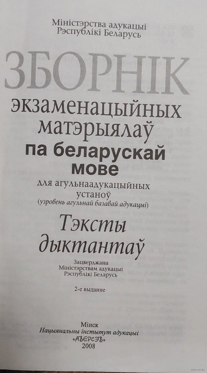 1. Зборнік экзаменацыйных матэрыялаў па беларускай мове для агульнаадукацыйных устаноў: (узровень агульнай базавай адукацыі): тэксты дыктантаў / Міністэрства адукацыі Рэспублікі Беларусь, Самедава, Н. В., Саўчук, Мінск , Нацыянальны інстытут адукацыі Аверсэв, 2008