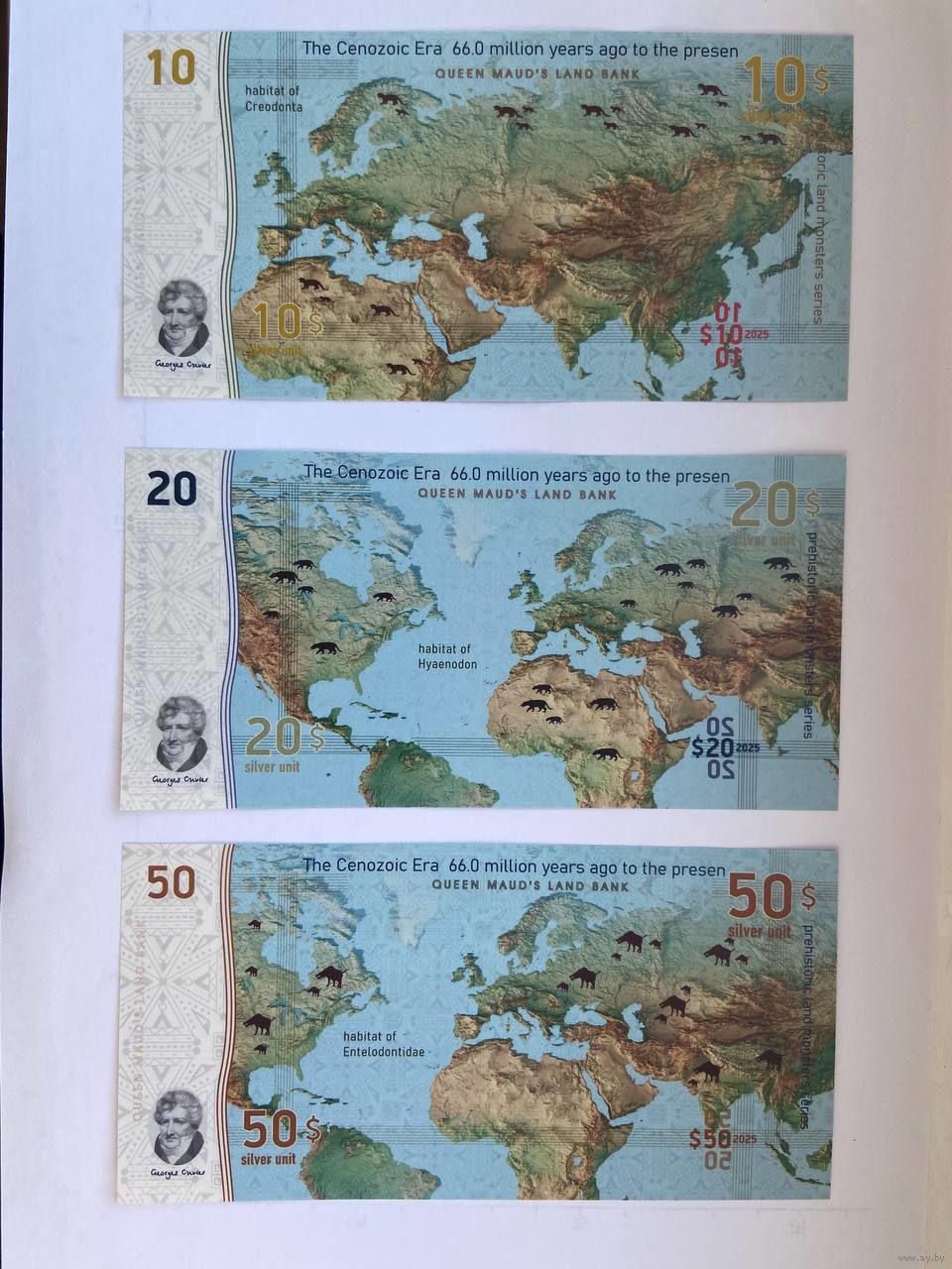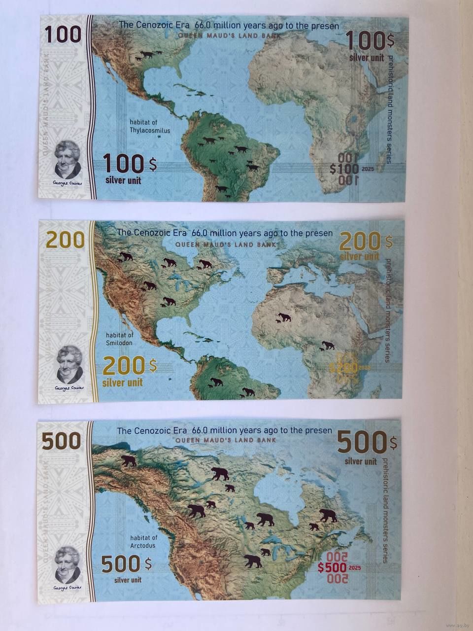 Серия - "Доисторические земные хищники". Неофициальная денежная единица – серебряный доллар. Эти банкноты выпущены специально для коллекционеров бон. На лицевой и оборотной сторонах банкнот изображены различные представители фауны и места их обитания. Эти "коллекционные" деньги выполнены из пластика.