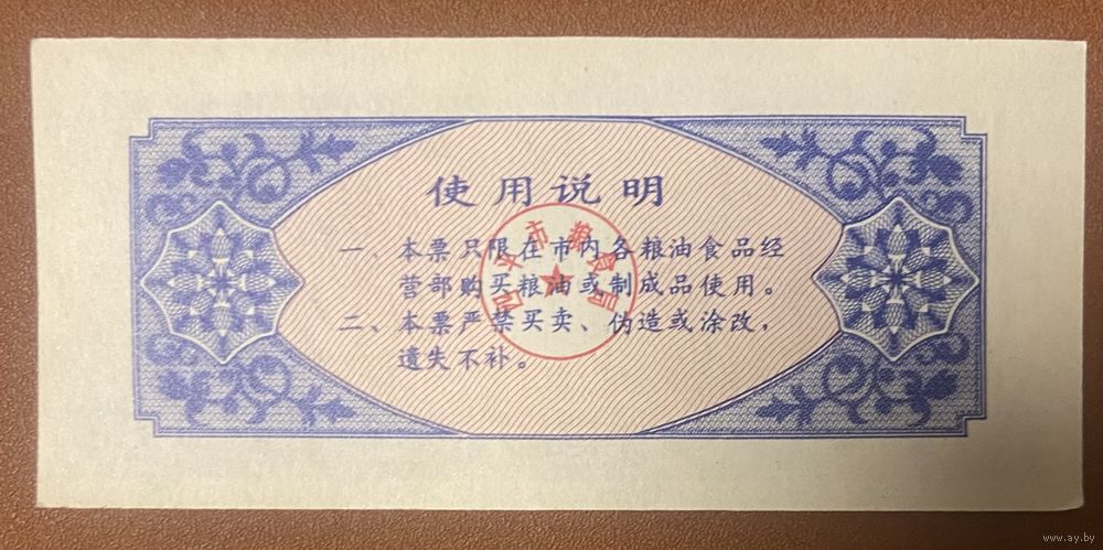 Зерновое бюро Сипинг Билет на питание для резидента 1987 год. Китай. С рубля без МЦ.