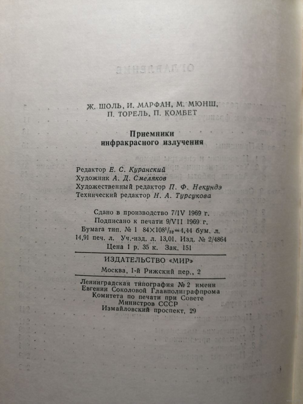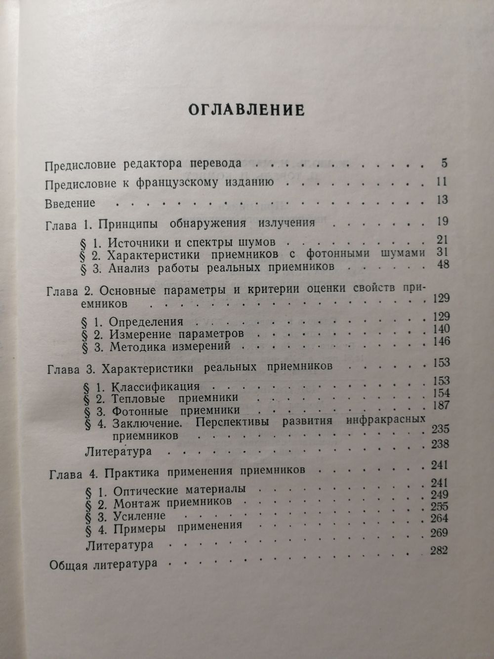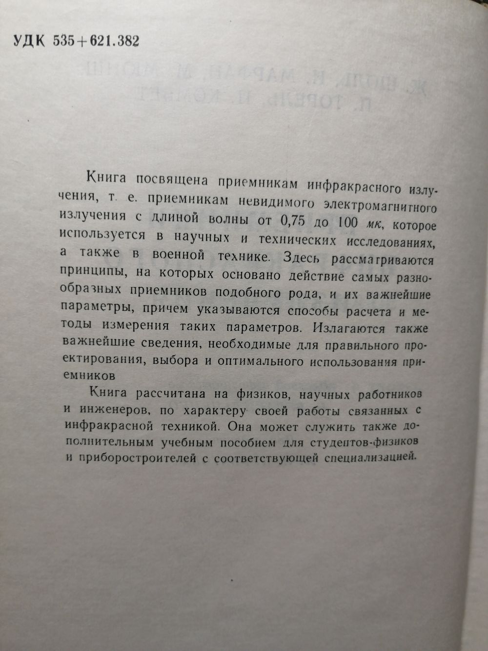 Книга посвящена приемникам инфракрасного излучения, т. е. приемником невидимого электромагнитного излучения с длиной волны от 0,75 до 100 мк, которе используется в научных и технических исследованиях, а также в военной технике. Здесь рассмотриваются принципы, на которых основано действие самых разнообразных приемников подобного рода, и их важнейшие параметры, причем указываются способы расчета и методы измерения таких параметров. Излагаются также важнейшие сведения, необходимые для правильного проектирования, выбора и оптимального использования приемников. Книга рассчитана на физиков, научных работников и инженеров, по характеру своей работы связанных с инфракрасной техникой. Она может служить также дополнительным учебным пособием для студентов-физиков и приборостроителей с соответсующей специализацией.