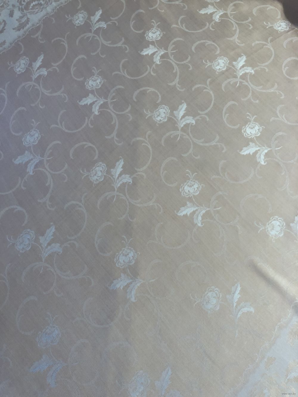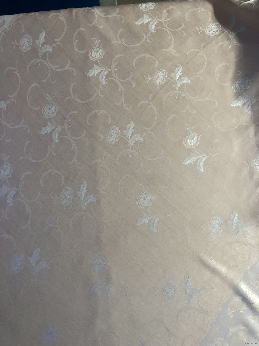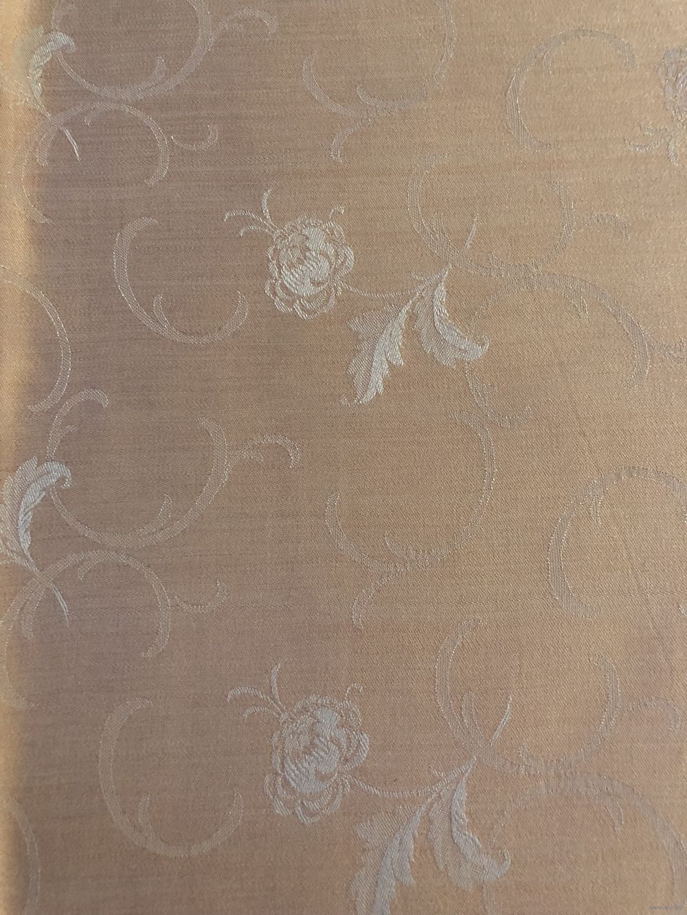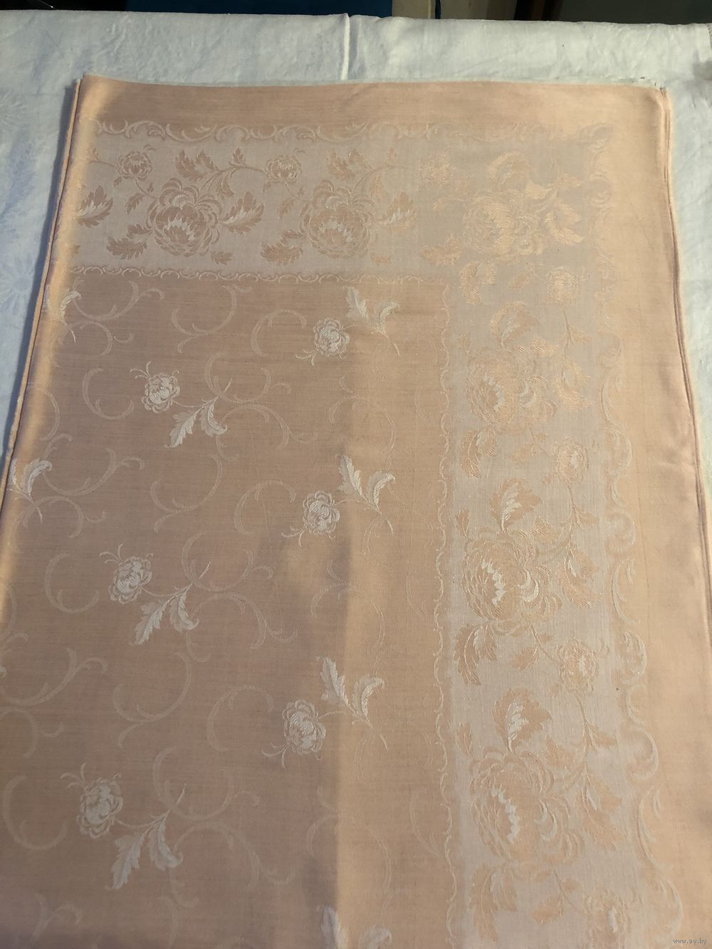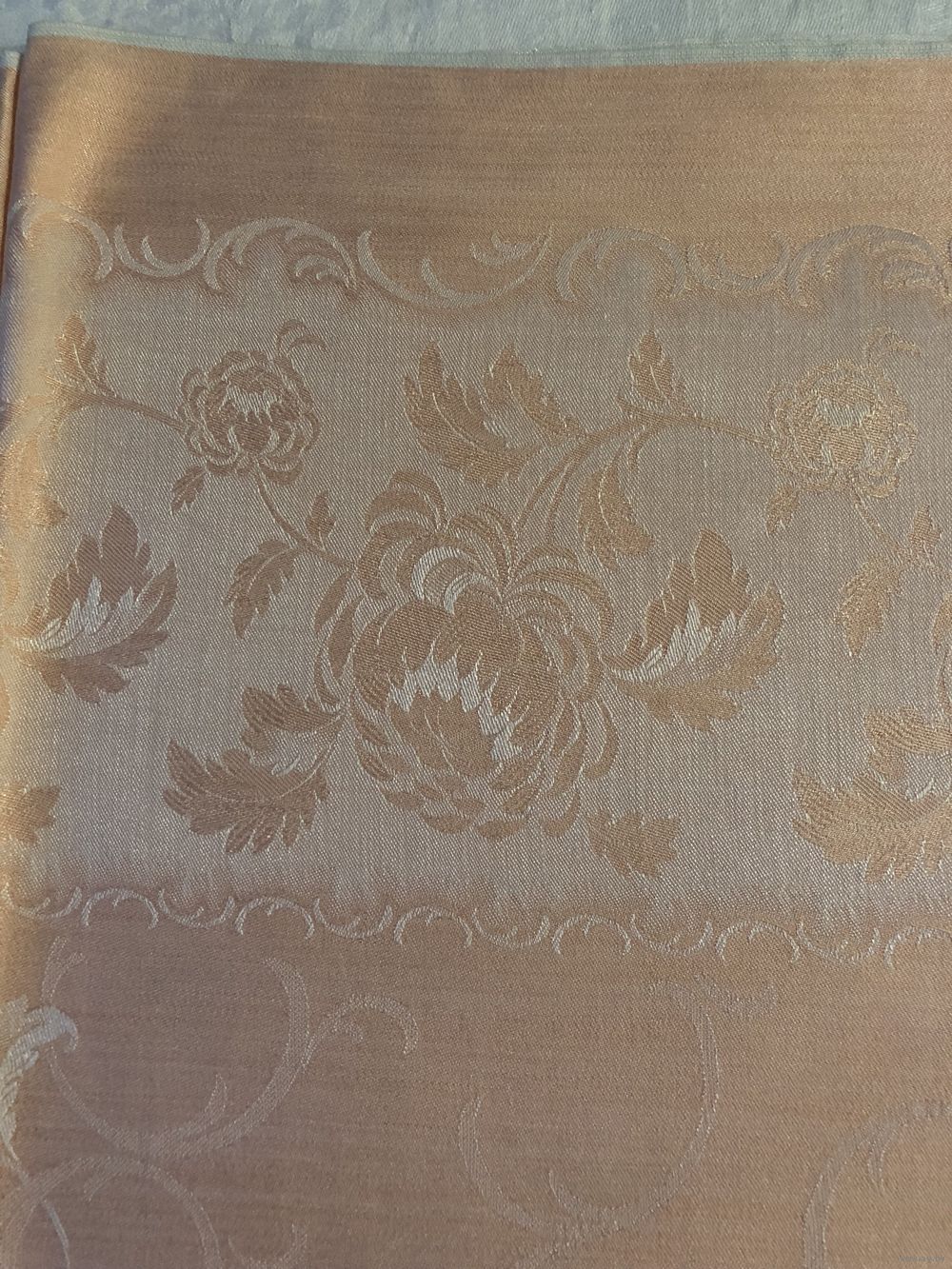 винтажная скатерть периода СССР (примерно 1970-е годы) из жаккардовой ткани (дамаста) нежно-розового или персикового цвета с характерным тканым цветочным узором.