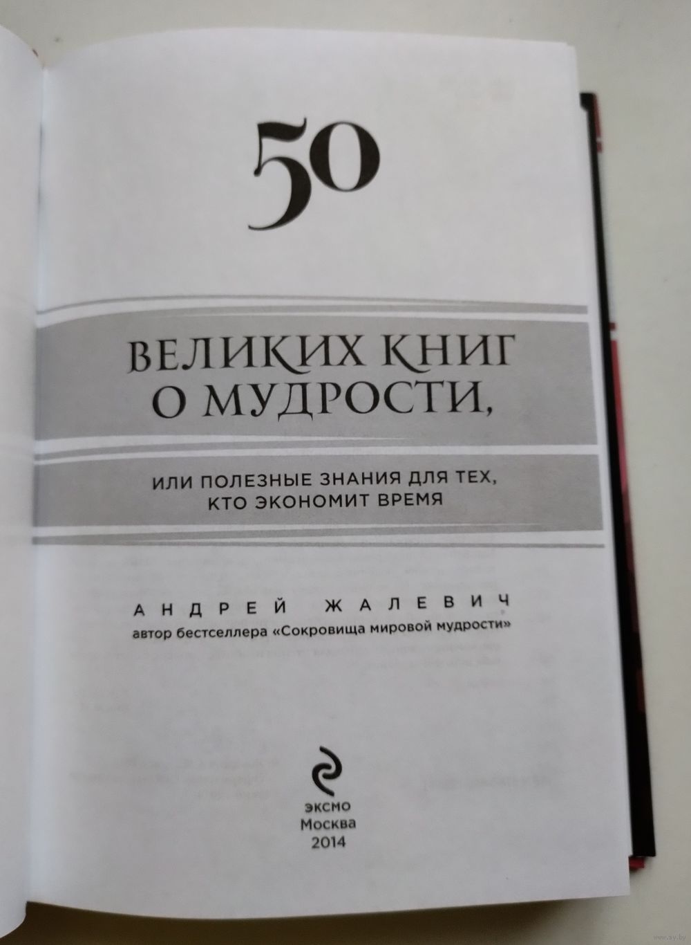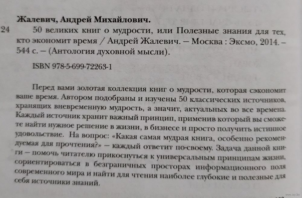 Жалевич А.М. 50 великих книг о мудрости, или Полезные знания для тех, кто экономит время. Серия: Антология духовной мысли. М.: Эксмо, 2014г., 544 с. Твёрдый переплёт, чуть увеличенный формат.