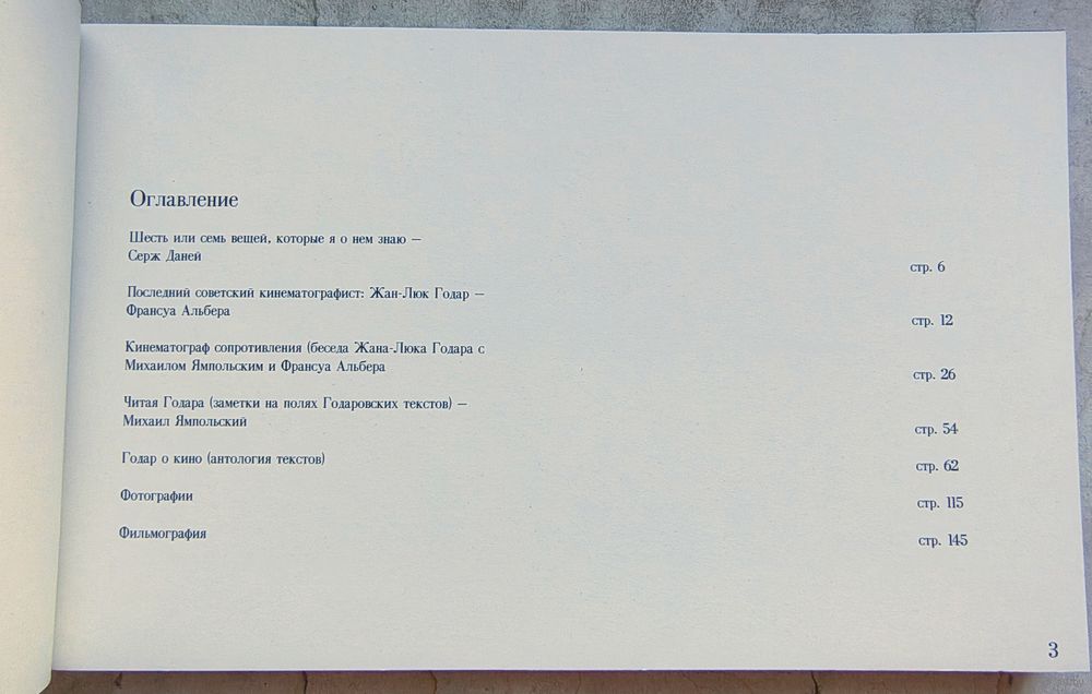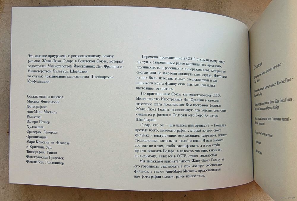 Это издание приурочено к ретроспективному показу фильмов Жана-Люка Годара в Советском Союзе, который подготовлен Министерством Иностранных Дел Франции и Министерством Культуры Швейцарии по случаю празднования семисотлетия Швейцарской Конфедерации.