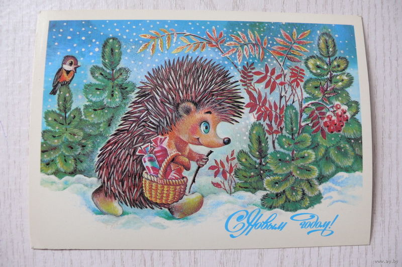 Жебелева Т., С Новым годом! 1986, 1987, чистая, из сувенирного комплекта (ежик, рябина).