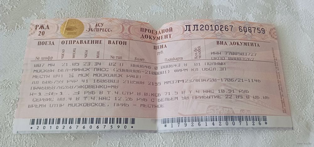 На фотографии представлен железнодорожный билет (проездной документ) Российских железных дорог (РЖД).