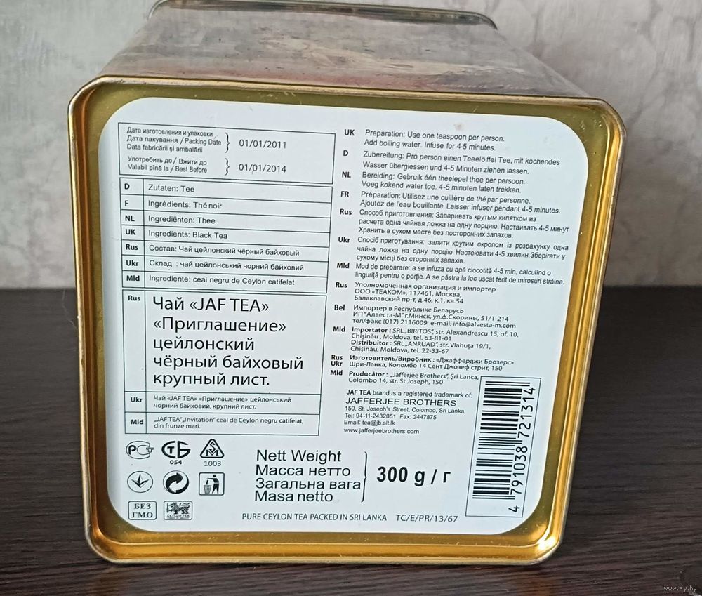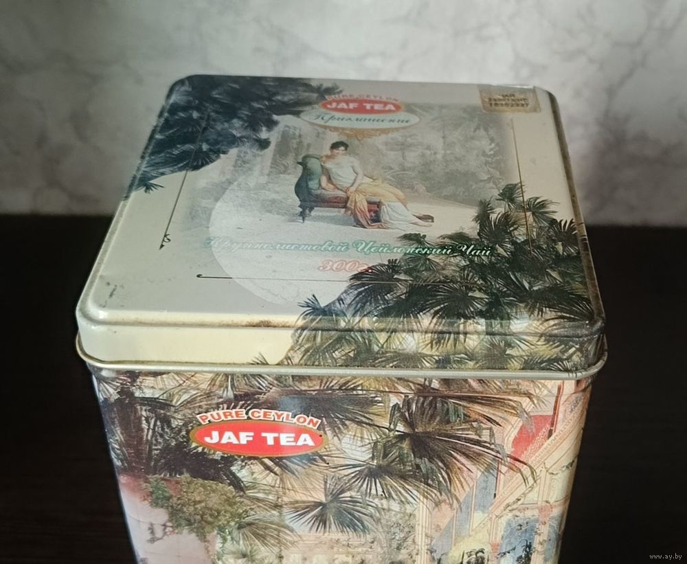 Жестяная баночка из-под чая "JAF TEA", высота 15 см, ширина 11 см.
